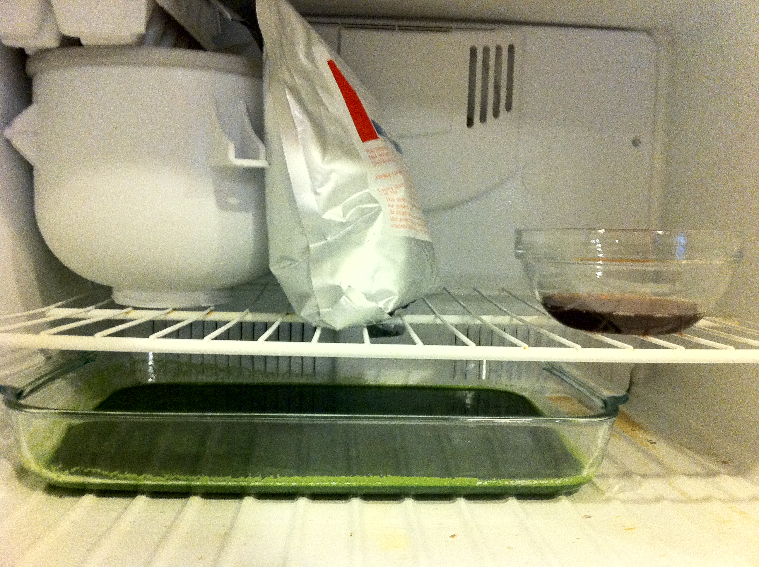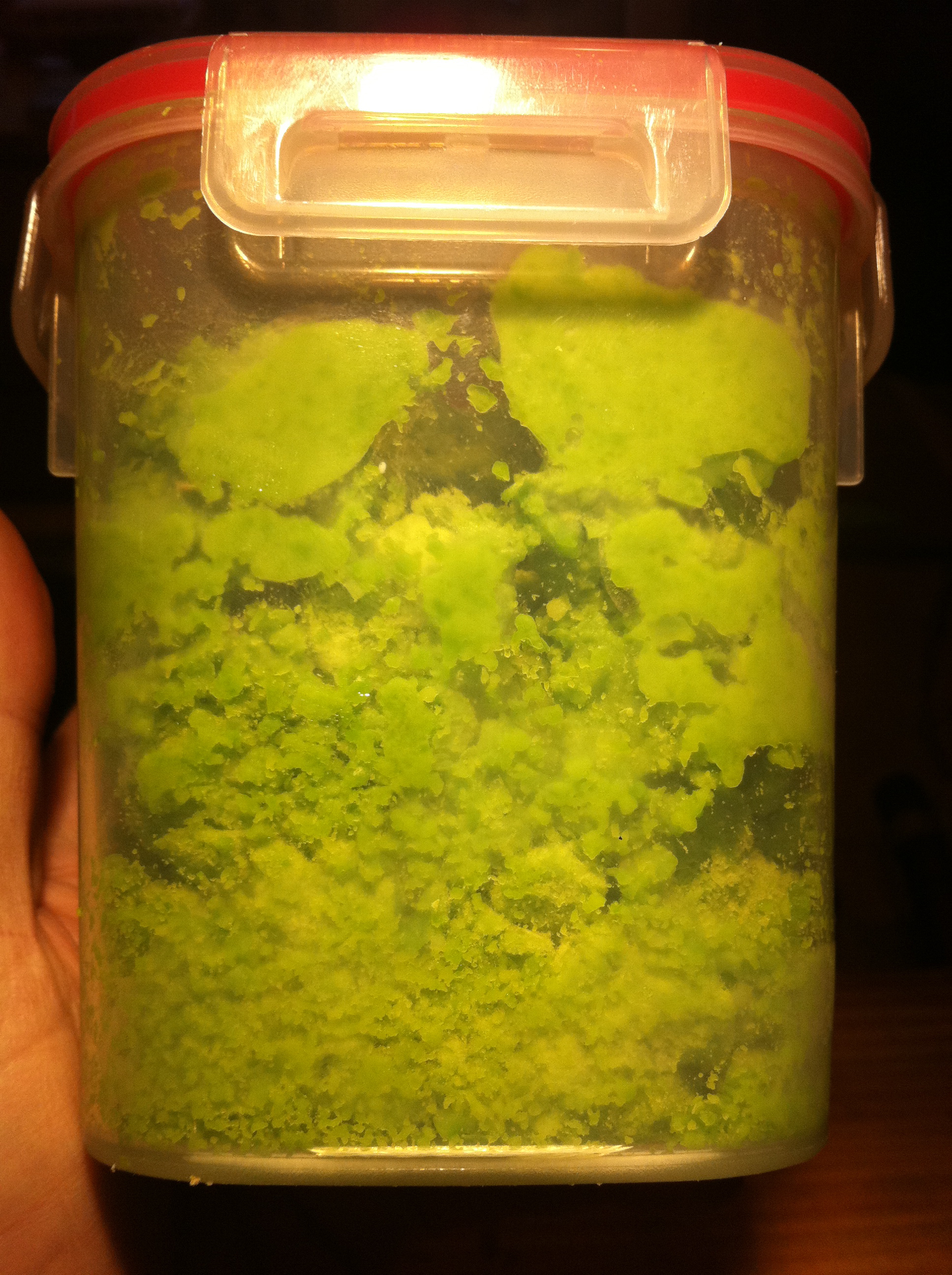 The chefs recommended a bag of high quality organic peas. My local store had Kroger brand. Well, hey, I gotta start somewhere. I brought home a bag and threw them in the Vita-Mix for their first spin of the day. It ended up being a very bright green frozen powder. I put the pea dust into one of my centrifuge containers and filled the rest of the containers with water as counterweights.