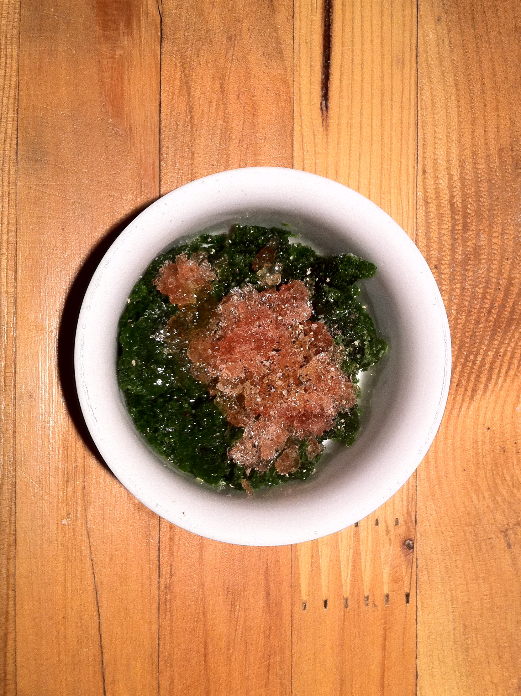I scraped off the fat and put it on a piece of bread. Pure bright pea flavor. It’s really, really good. The pea pellet and pea water were also striking in their own way as well.