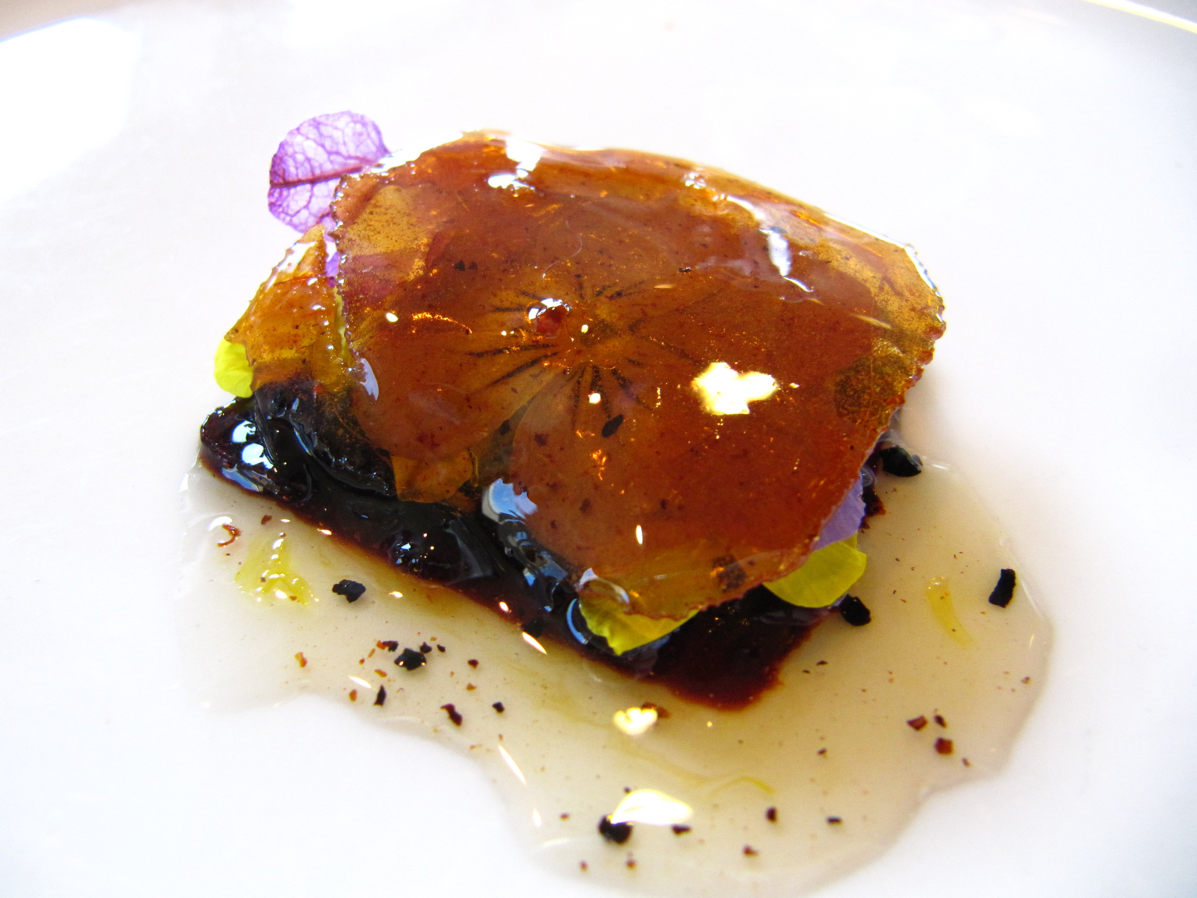 Work with pure cote-b790 and ultra tex is starting to pay off.   Traditional fruit leather on the bottom flavored like a candied apple.  Flowers are from my garden.  Glass is made of fresh orange and pear juice.  Sauce is an urfa biber and orange zest syrup heated to collapse the glass tableside.