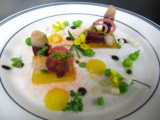 blueberry gelee, cherry coulis, copper river salmon, edible flowers, microgreens, plating