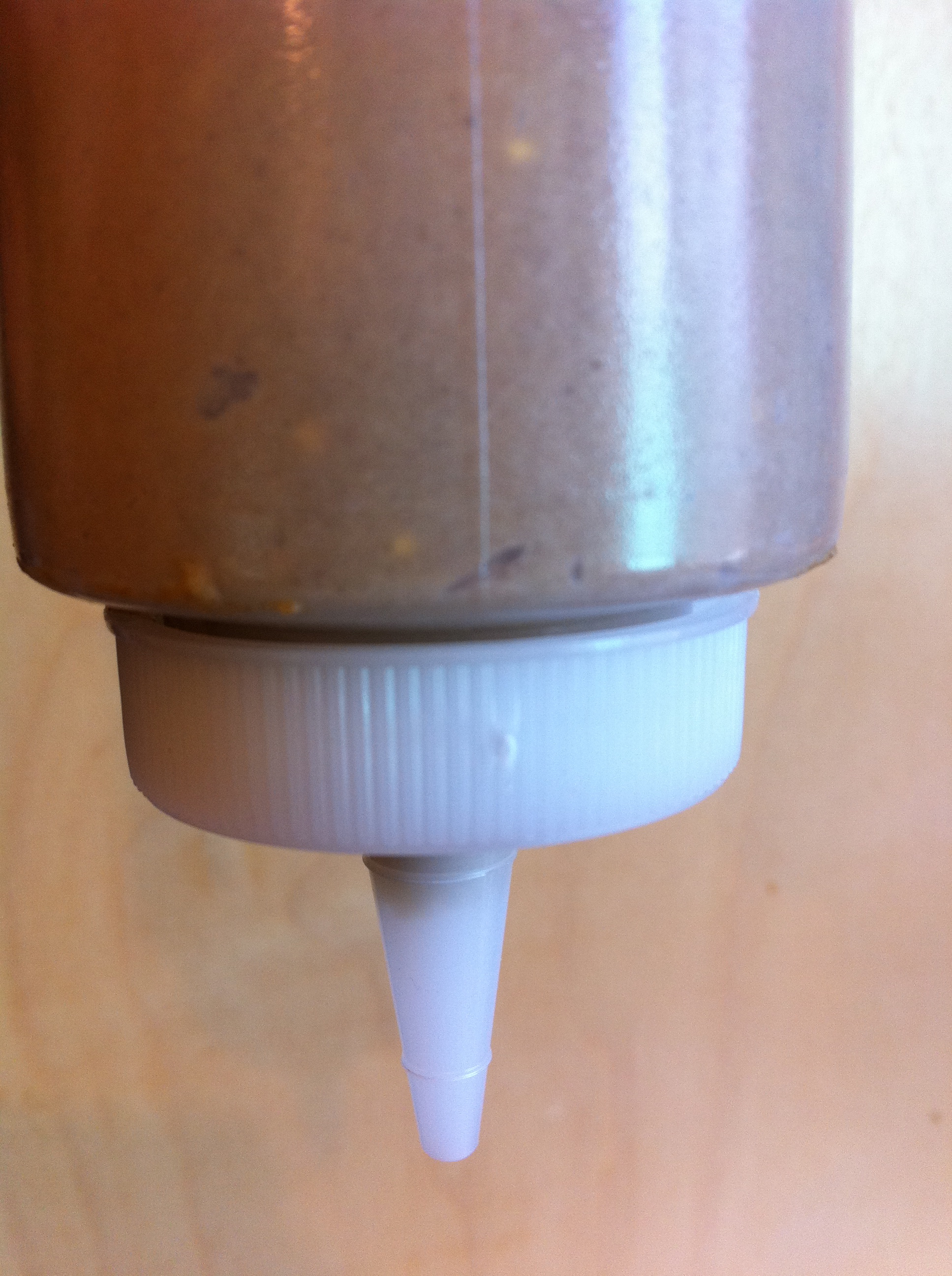 When creating the striped omelet recipe from the Modernist Cuisine cookbook, a pastry comb is dragged through the mushroom puree to create the stripes.  I had leftovers, and was making another omelet, when it hit me – why just do stripes? So I put the puree in a squeeze bottle instead.