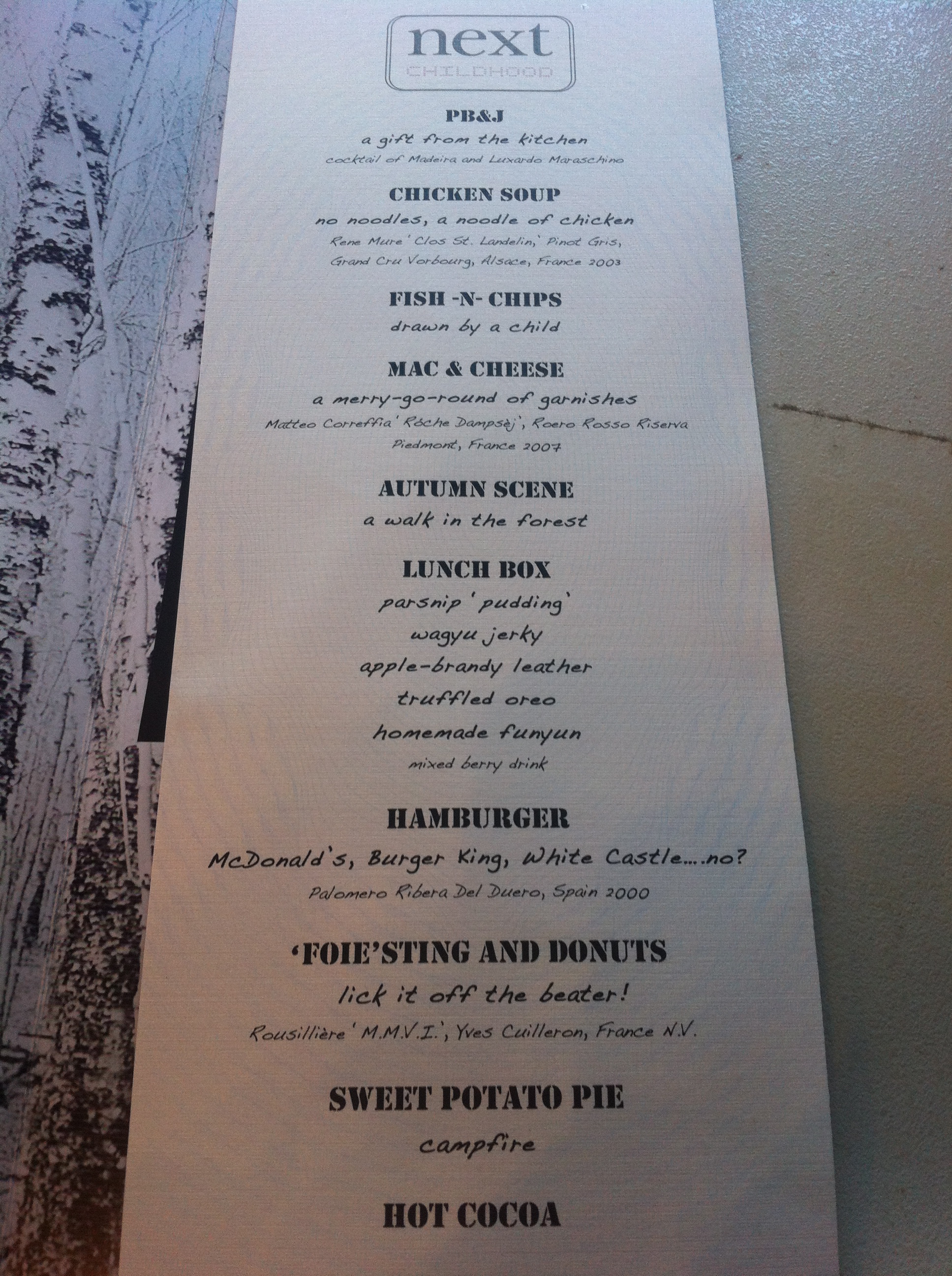 So, really, what is there to say? I ate the Childhood menu on opening night at Next Restaurant. Do you really want a review? OK. If I had to describe it…I guess I would say it was mind blowing. It was forward thinking and innovative. It was absolutely amazing. It was completely and totally unique. And quite possibly the best meal I’ve ever had.