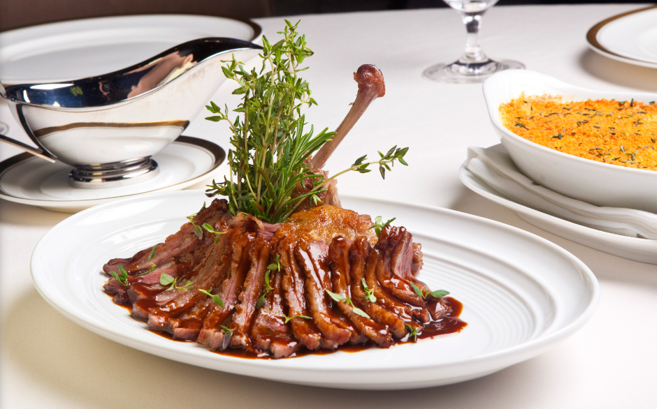 Roast the duckling for 20 minutes and send it to the table immediately, where is is finished as follows: