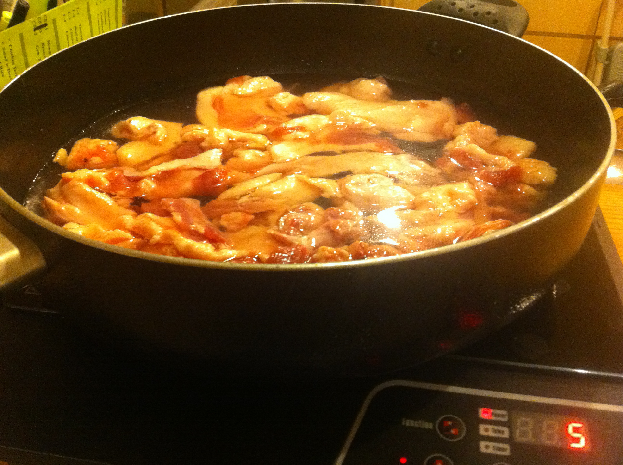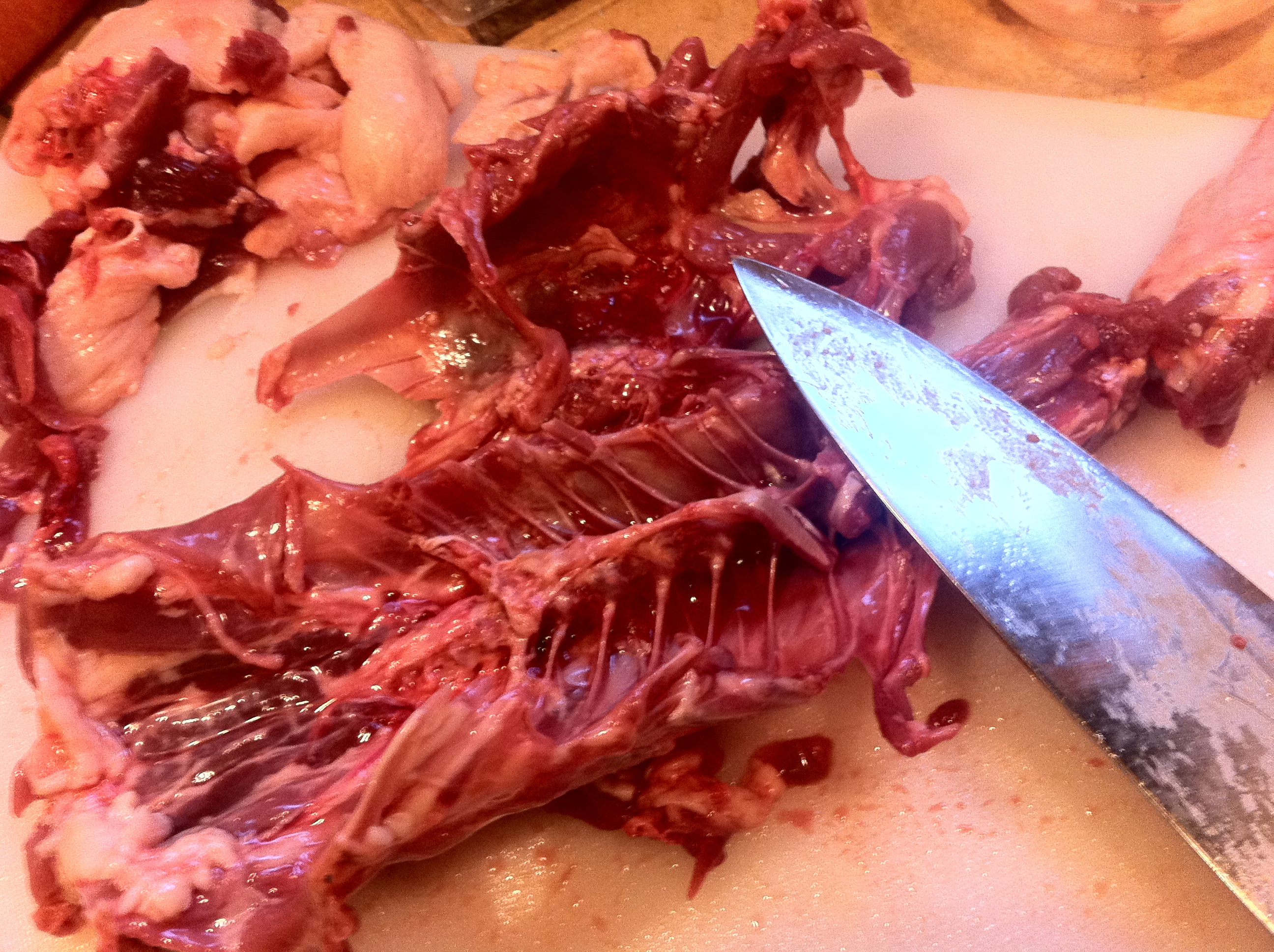 Wow.  That’s a pain in the ass.  Trying to knick off all these little slivers without destroying the breast meat is not easy.  And to think there’s some guy doing it all day in the back kitchen. Mad respect, yo.
