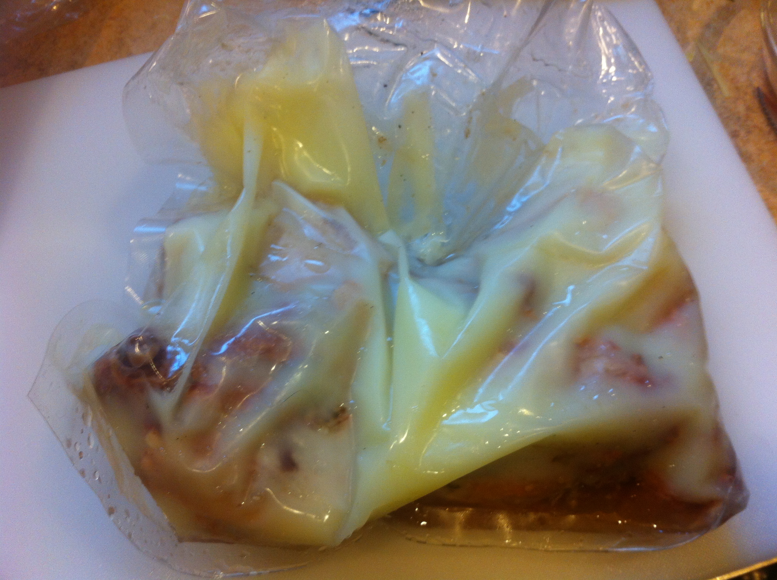 So of course all of this wasn’t happening in sequence.  I was getting things done while the stocks and sauces were reducing.  The legs were a project in themselves.  They were packed in salt and peppercorns for four hours, and then needed to be vacuum sealed with 100 grams of duck fat for each leg.  In my case, 400 grams.  So I needed to render the fat.  I collected my trimmings (Isn’t that a lovely word for hacked bits of flesh?  “Trimmings”?  Lovely, I say.) and boiled them for 30 minutes and strained out the bits.  I poured the fat into the bag and sealed it up.