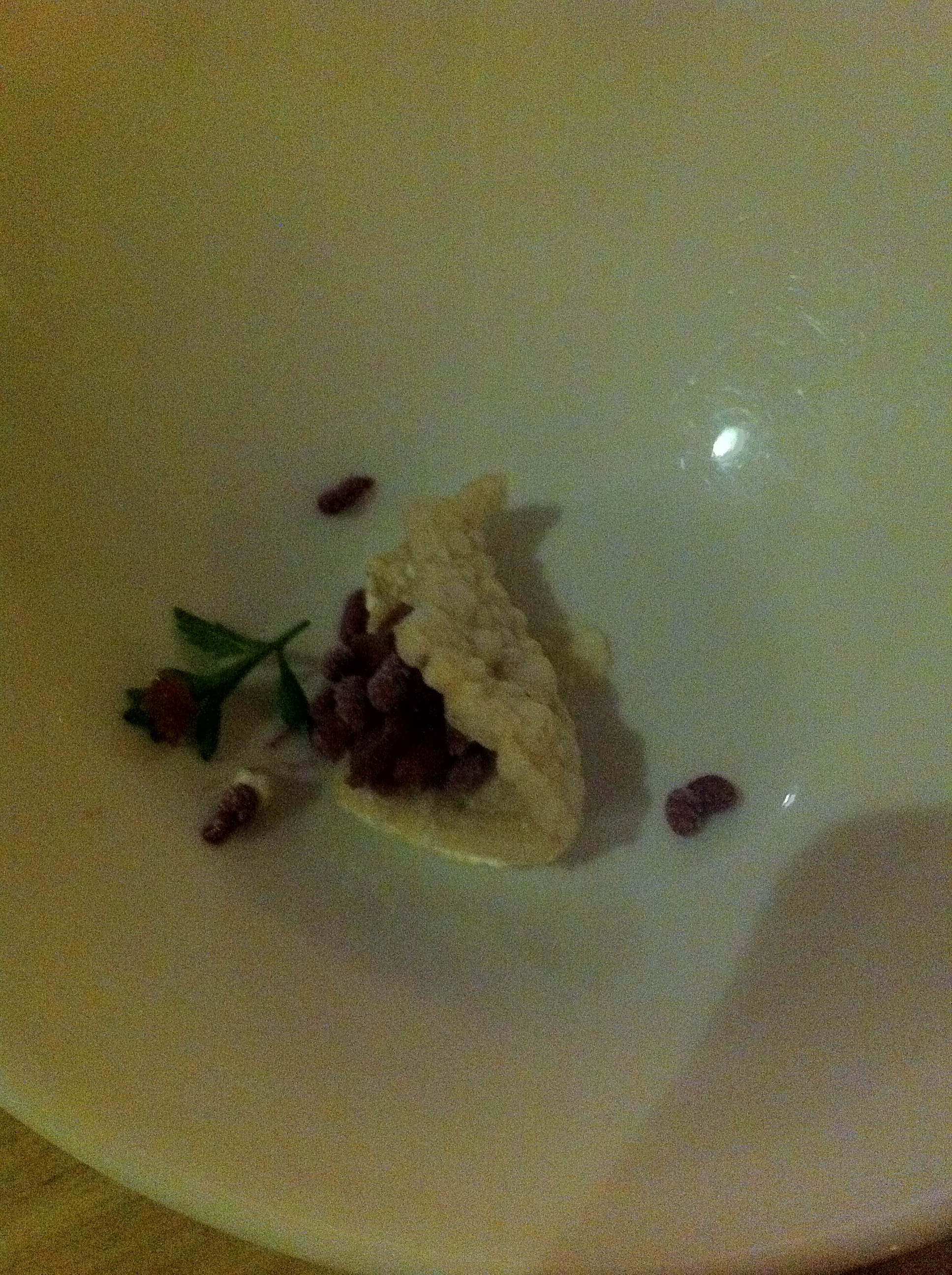 They were busy and it was late, but they were still serving and had a single spot open at the bar so I took it. It has a friendly gastropub feel. I had a guy in the kitchen in front of me alternately freezing things in N2O and burning things with a blowtorch. The very hot/very cold station, I suppose. My kind of place. I decided on the tasting menu. So yeah, I’m one of those annoying guys who takes crappy photos of each course with his phone – and here they are: