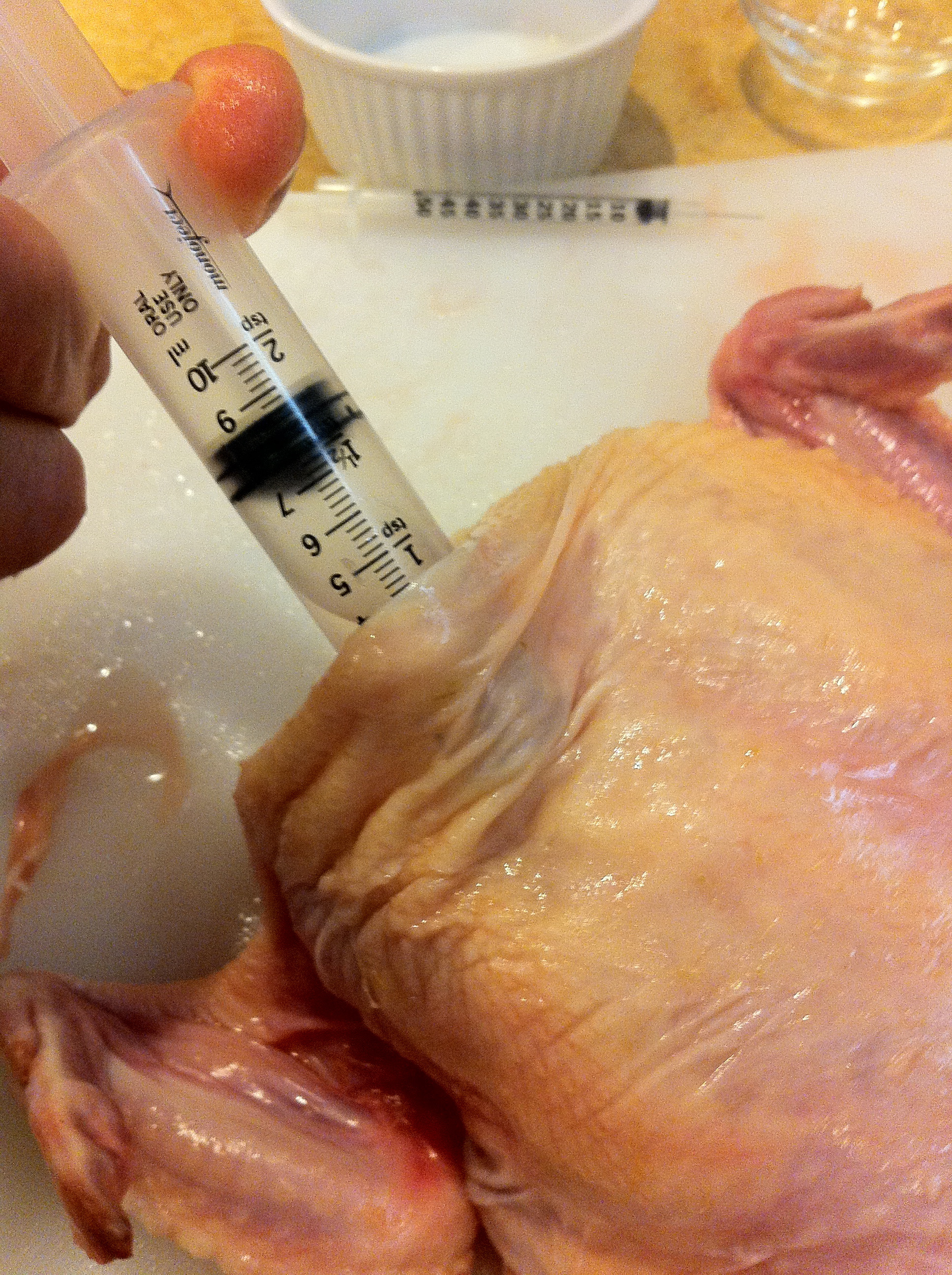 It was a slow process, as I didn’t want to tear it up. I did a good job, with only one small tear at the joint of one the legs. Next I took the salt brine and injected it into the breasts, 10% of the total weight of the bird. I somehow thought a small needle would be all I needed, but I had to pull out the big guns to fill them up.