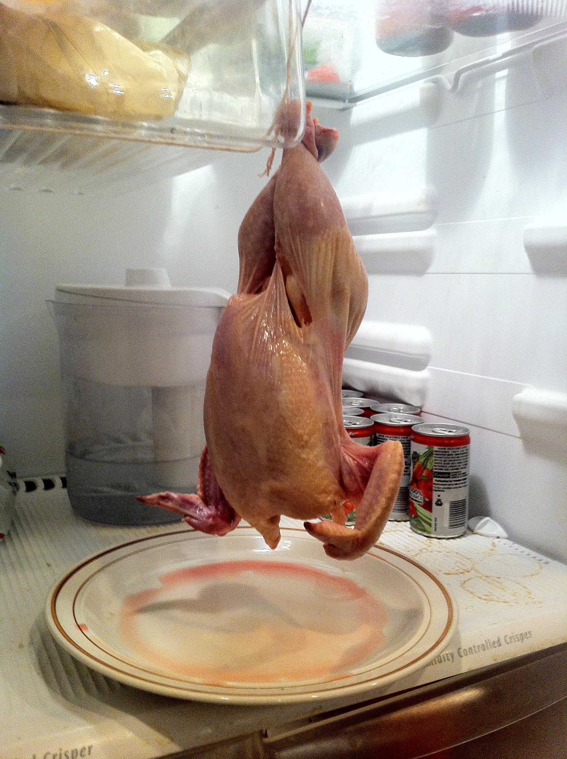 The next step was to air dry the bird for 48 hours. This will dry out the skin and make it extra crispy and delicious, and well as let the brine suffuse through the meat. But it needs to be hanged to do it properly. So I got some twine from the local butcher, and strung it up in my fridge where I left it to hang out and dry out.