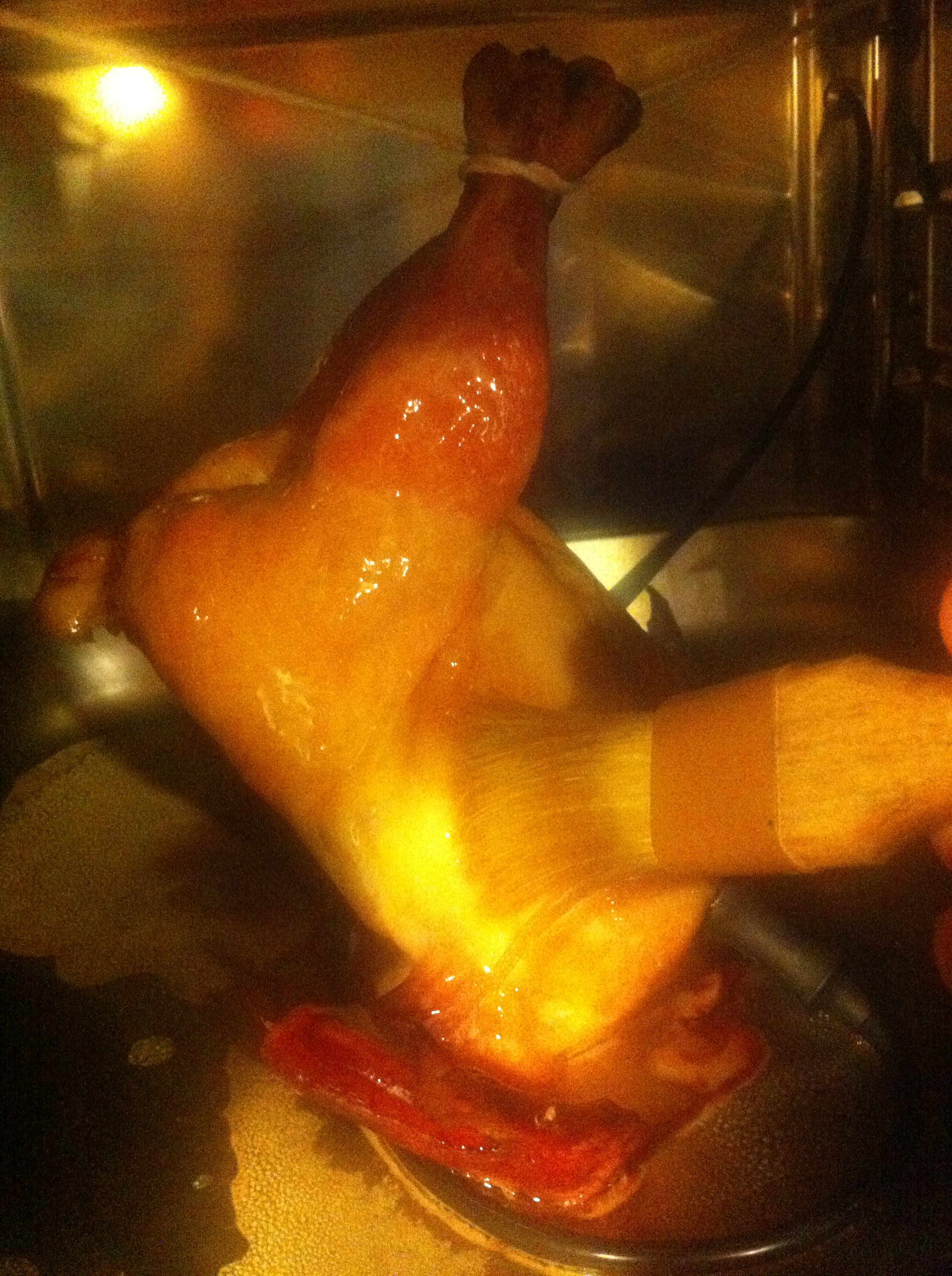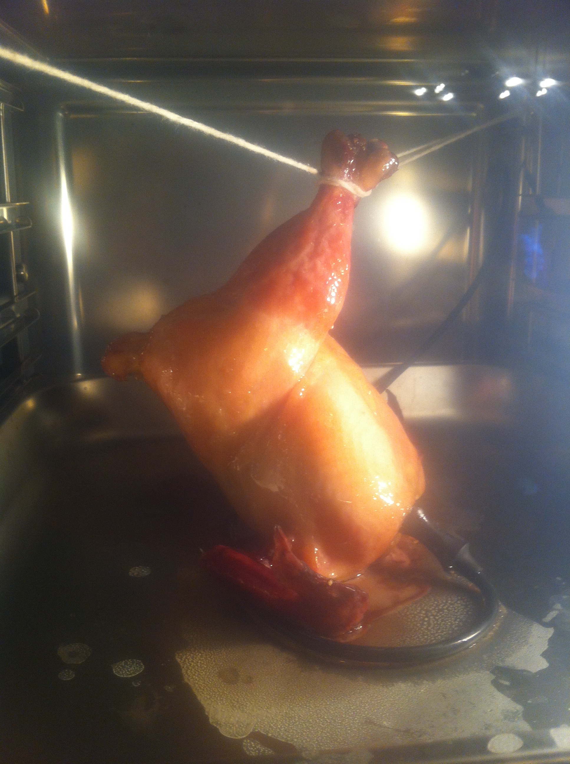 My poor hen had another round of salt injections, and then I needed to hang it in my combi oven to cook. My oven was still too small even for this smaller bird for it to hang completely. If I laid it down in a pan, one whole side of skin would be in contact with the meat and get wet and not crispy and delicious. I had to improvise. And so I took my hen by the twine, and jury rigged her in there.
