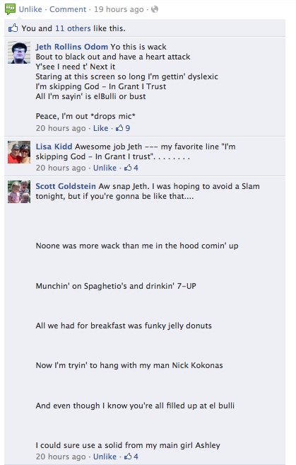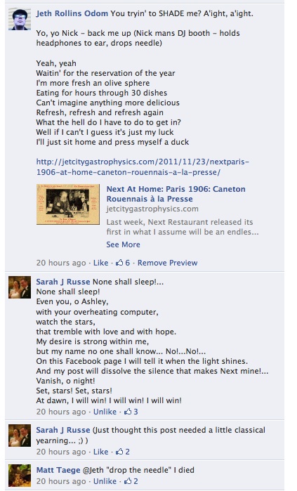 Last week, Next Restaurant decided to reward the active “Nexties” on their Facebook page by choosing 120 people or so to dine there on opening week through email submission. Over 5000 people sent in an email. The Facebook page was abuzz last Monday evening as people waited to see if they had been picked. A myriad of posts were put up on the page, with people commenting on various threads. It was in many ways like a big party. One guy put up lyrics, which was followed by a limerick. Then I joined the fray, and it began to spin wildly out of control.