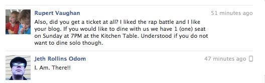 So, yeah, we were all getting a little punch drunk. Sadly, an confirmation email never arrived for me. I missed the boat, and would have to try for season tickets (which turned out to be that you would have had to enter the site within TEN SECONDS or miss out. Serious demand.). The following day I received a private message from Rupert Vaughan. He’s considered “the Mayor of Next”, having been to each menu they’ve served – twice. After inquiring about restaurants in San Francisco from my earlier posts, this happened: