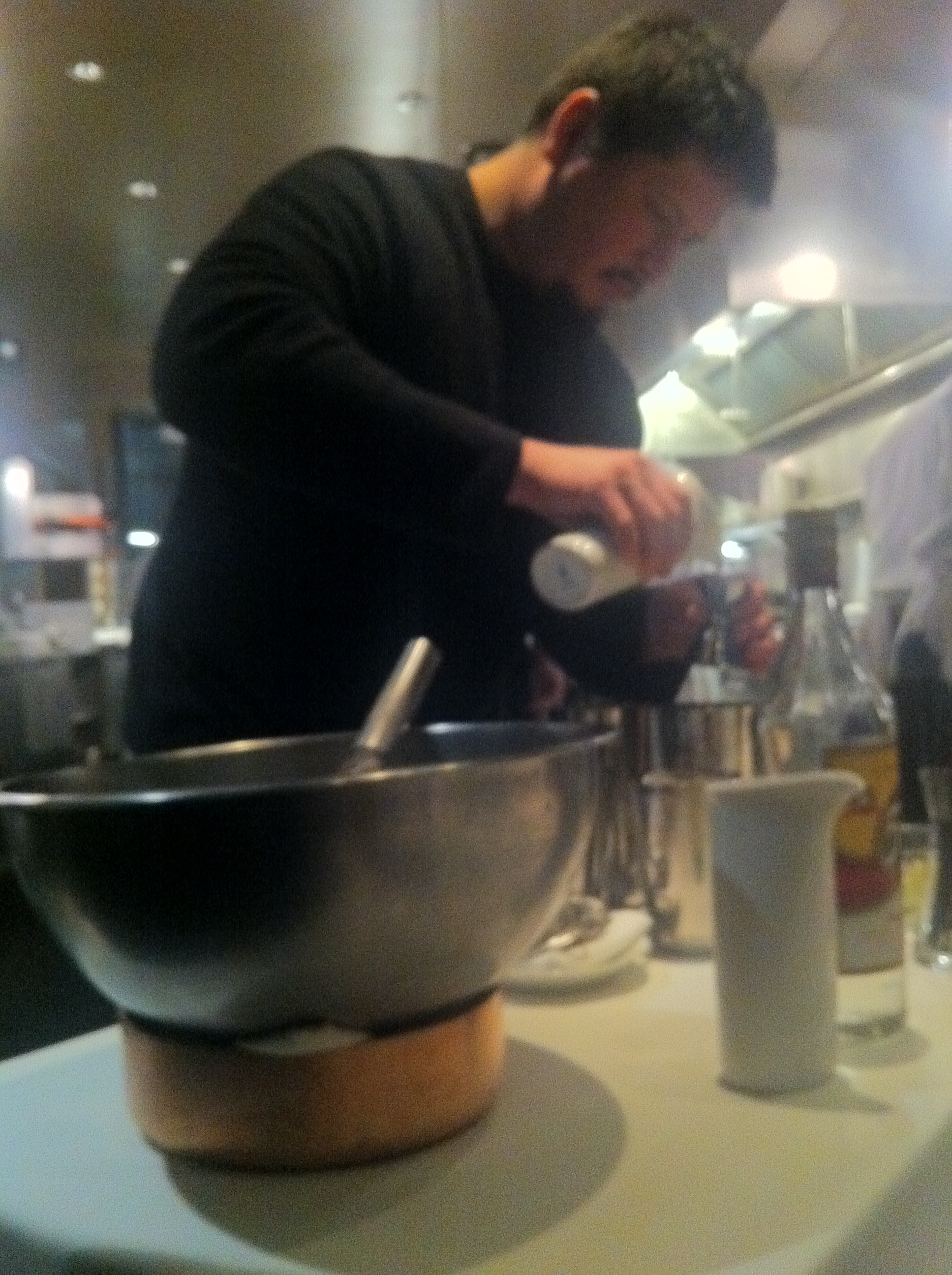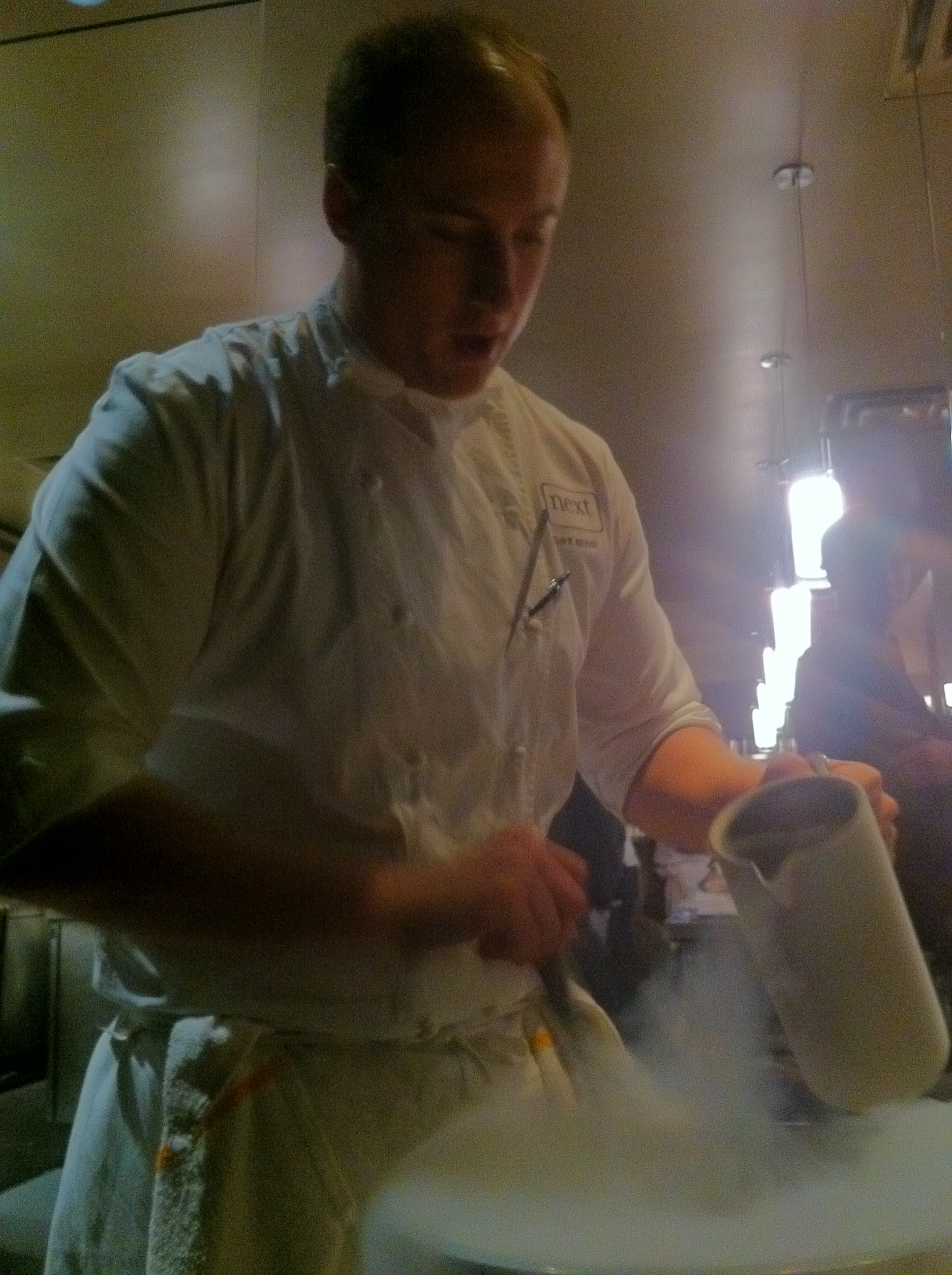 As befitting the Mayor of Next, we sat at the Kitchen Table. It’s a round table that seats six, walled off from the rest of the tables. One wall, however, is made of glass, and looks into the kitchen as they prepare and plate the dishes. Liquid Nitrogen boiling away in styrofoam boxes, dishes being individually weighted to make sure every dish gets the exact proportion. It’s always eye opening to see a kitchen execute a menu like this. And well, it looks like this: