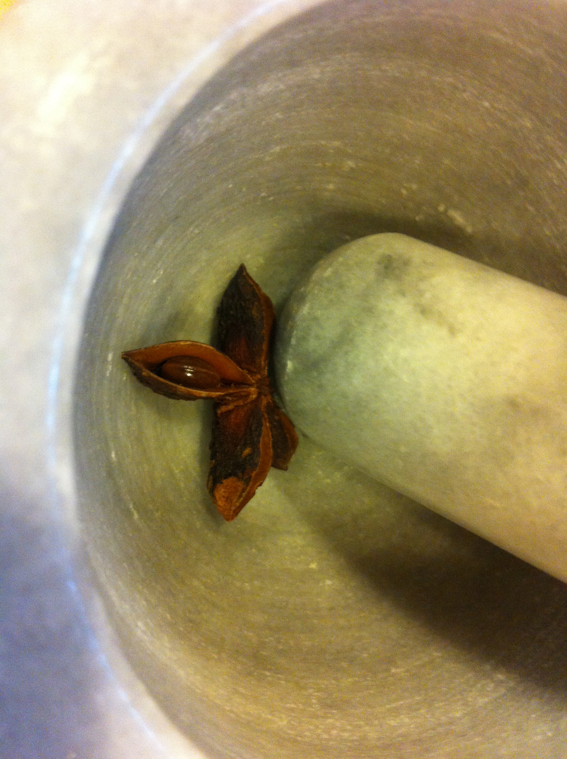 The key to a good pho is the broth. Now a broth is different than a stock. Broth is a fully seasoned soup that can stand on its own, whereas a stock is unseasoned and must be further refined before eating. Pho starts with water as the base, so I needed to nail it on the first go. First off was making a little sachet (there’s your French influence) of spices – peppercorns, cinnamon, star anise and allspice. I crushed, toasted, and wrapped my little scented packet up.
