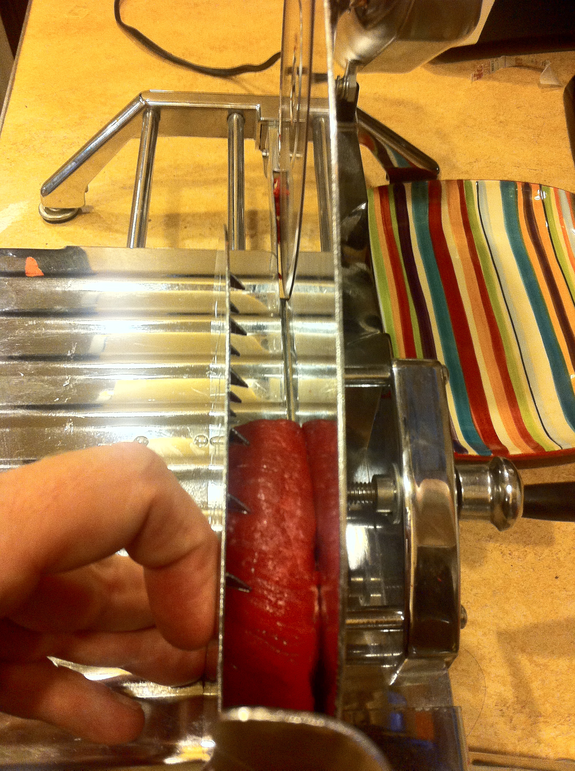 So with my broth complete, I just needed to make the rest of it. For the next component, the meat, I needed to slice it up. Here I got an excuse to pull out my hip and sexy meat slicer.