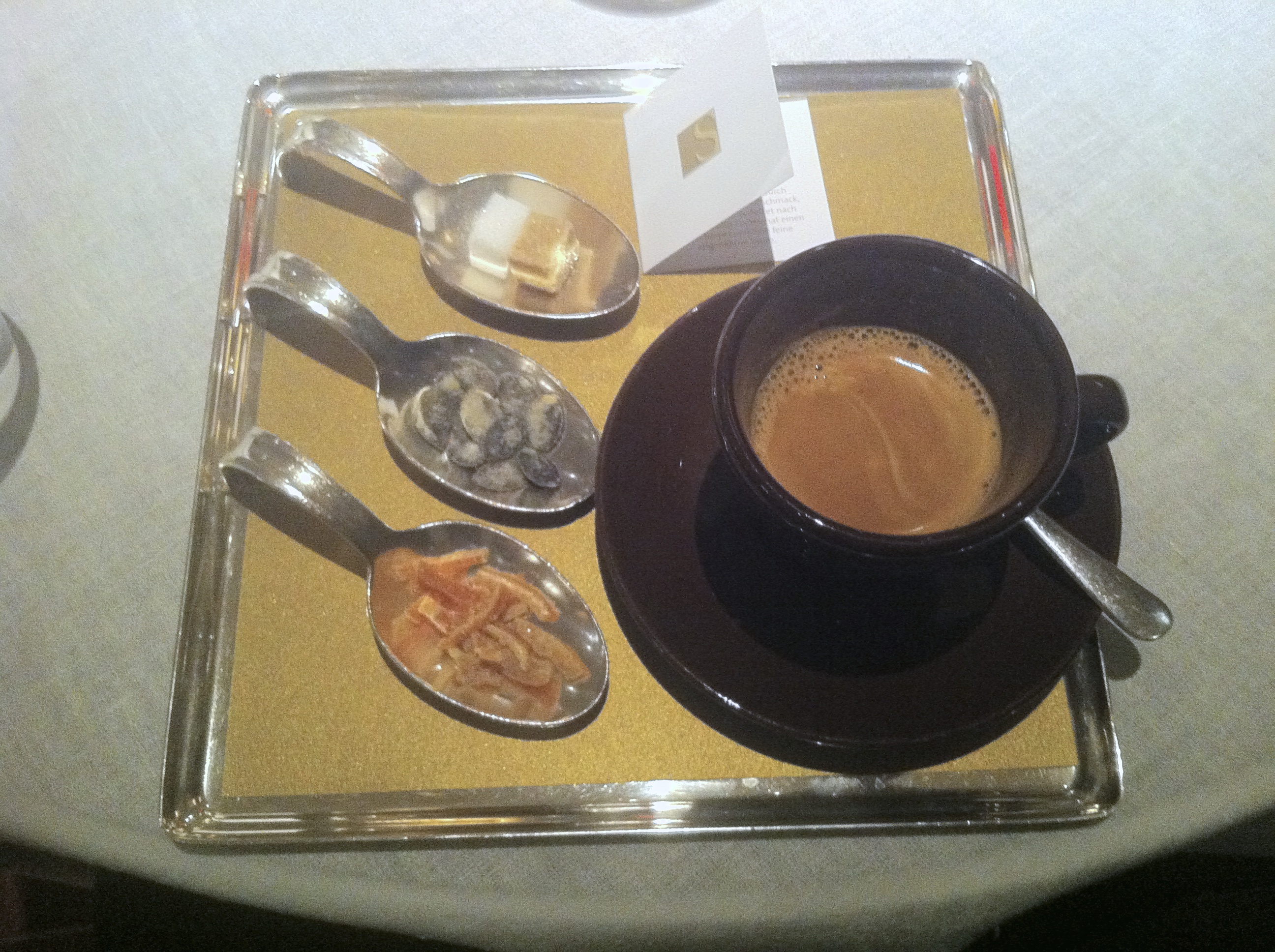 As a final course, they brought out a selection of chocolates – made up like a jewelry display. Very clever.