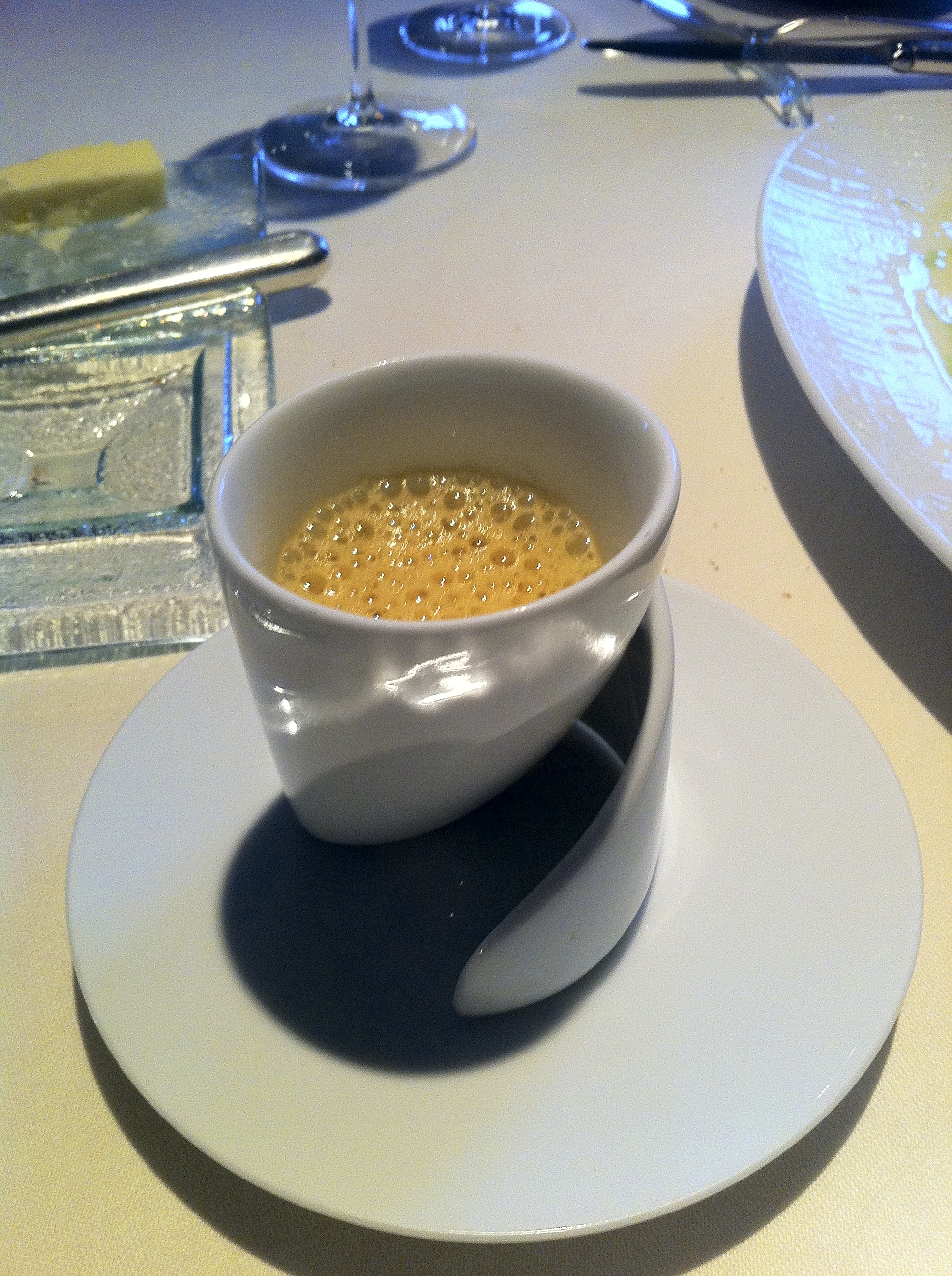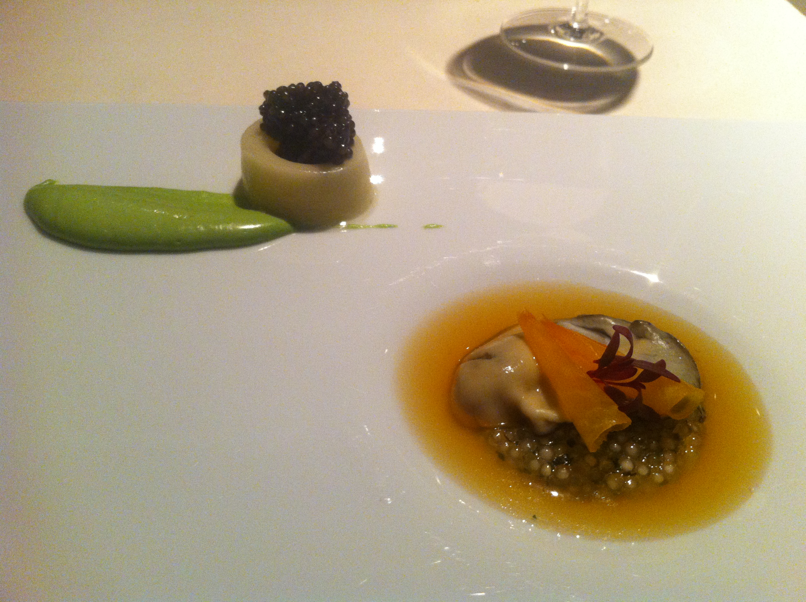 This was a very interesting progression of flavors. The first bite on the left was amazing, and made it very clear Chef Wissler knows what he’s doing. The second bite had a sweet tomato flavor. The third bite was with fish roe and salty – a sudden break and a real surprise on the palate. Then the fourth was creamy goodness.