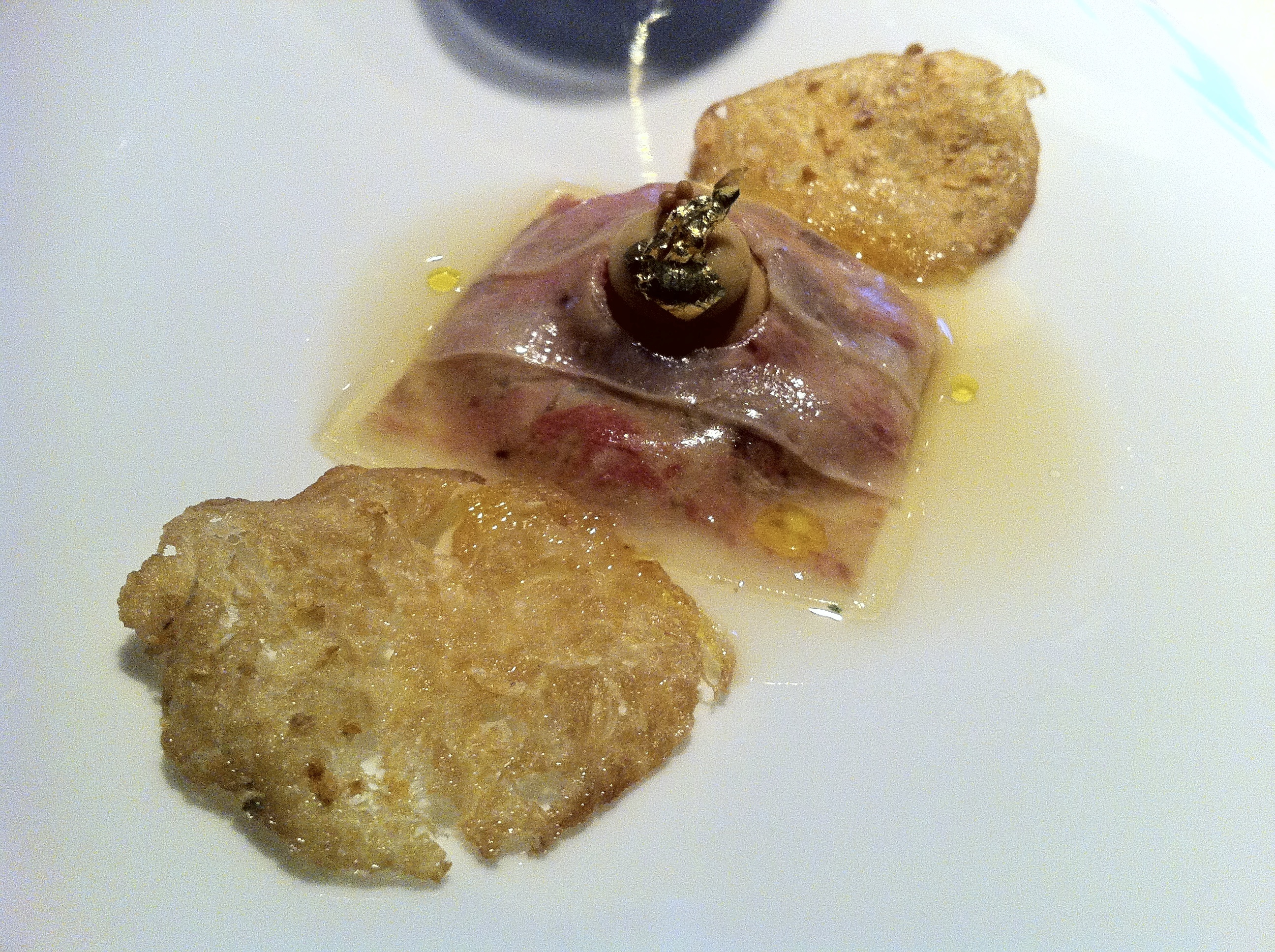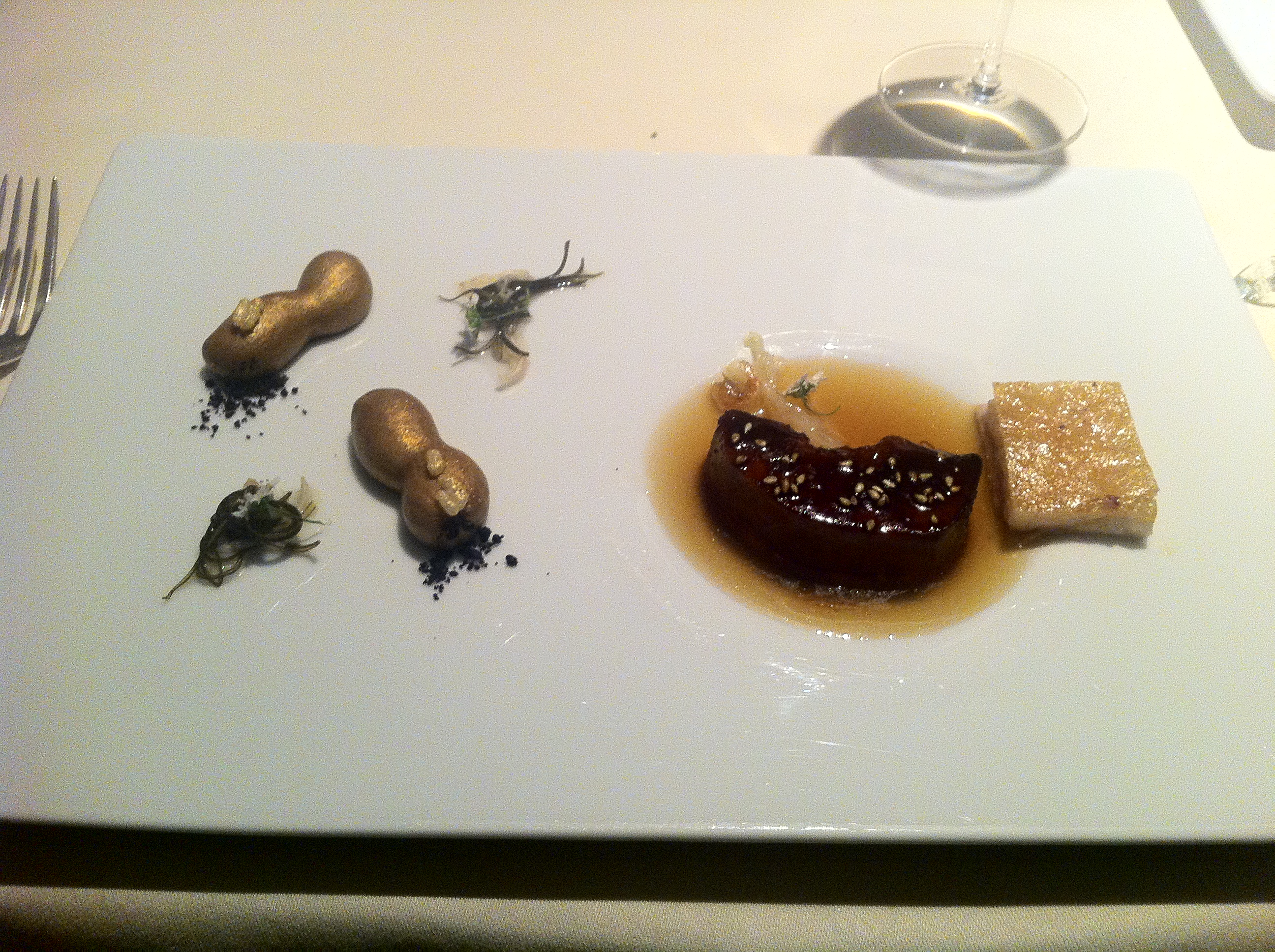 Does that look amazing or what? The taste matched it. Ah, finally the meat courses started, and with a bang: goose liver and pig snout. And do those look like peanuts? Yes they do, with a peanut cream inside. Not sure how they made those. And then……we waited for the next course. A long wait again – 30 minutes this time, and once again no heads up from the staff. What was going on? It was frustrating.