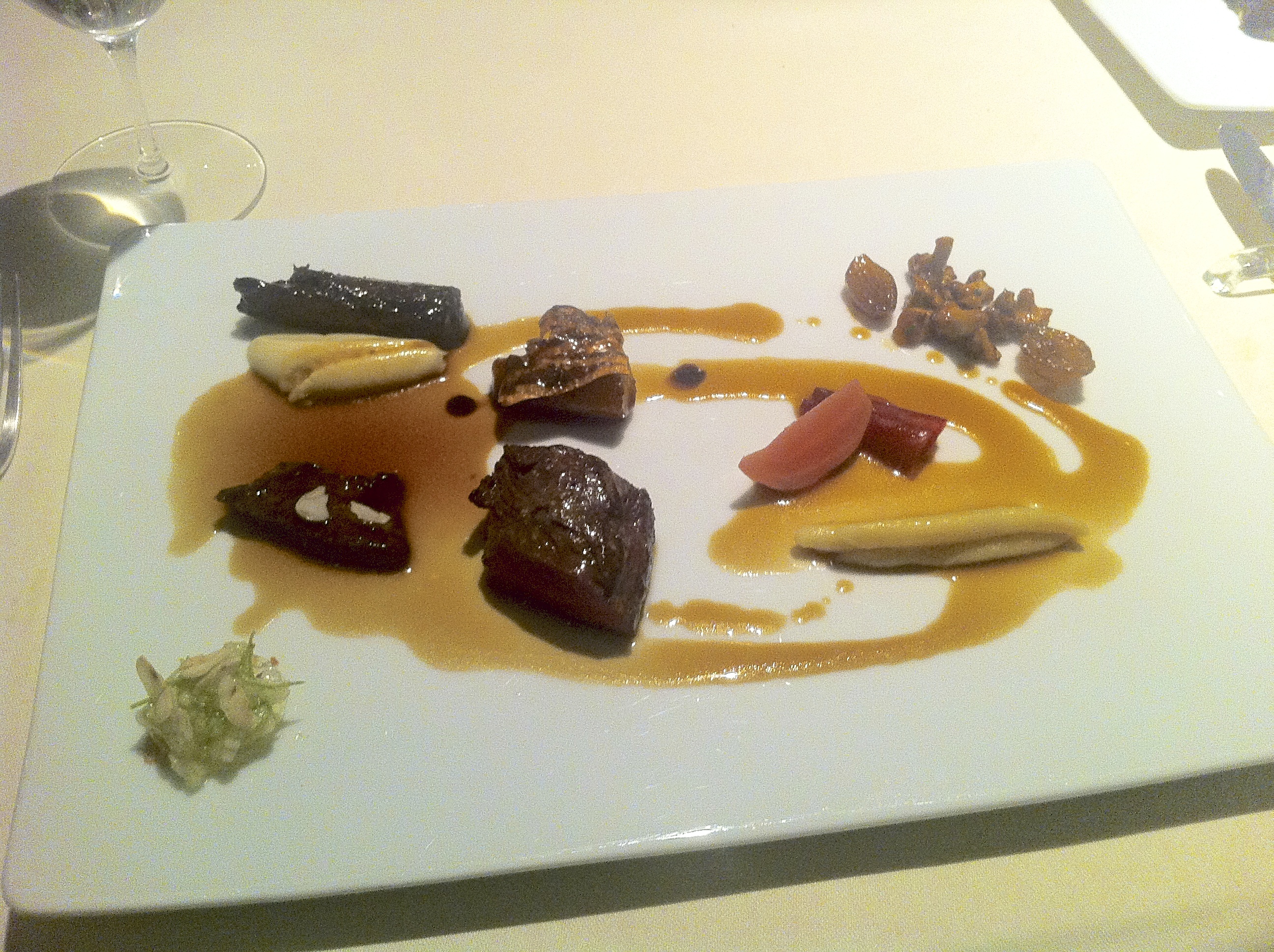 This was a great example of the “neue deutsche küche” philosophy – a high end ravioli topped with gold flake, that tasted like bratwurst with mustard. Taking a humble German food and elevating it. Delicious. And what to pair it with? How about a nice thin cow tongue crisp? Das ist gut. Another German transformation: red cabbage as a foam. Weeee! The broccoli was cooked in some mysterious way. The second your fork touched it, it fell apart; it was so soft it was almost like a cream. Kind of amazed how they got it on the plate without it smooshing. My girlfriend described this as eating a piece of art. The component in the upper left hand corner is a cauliflower couscous, cribbed from elBulli.Coursus Interruptus