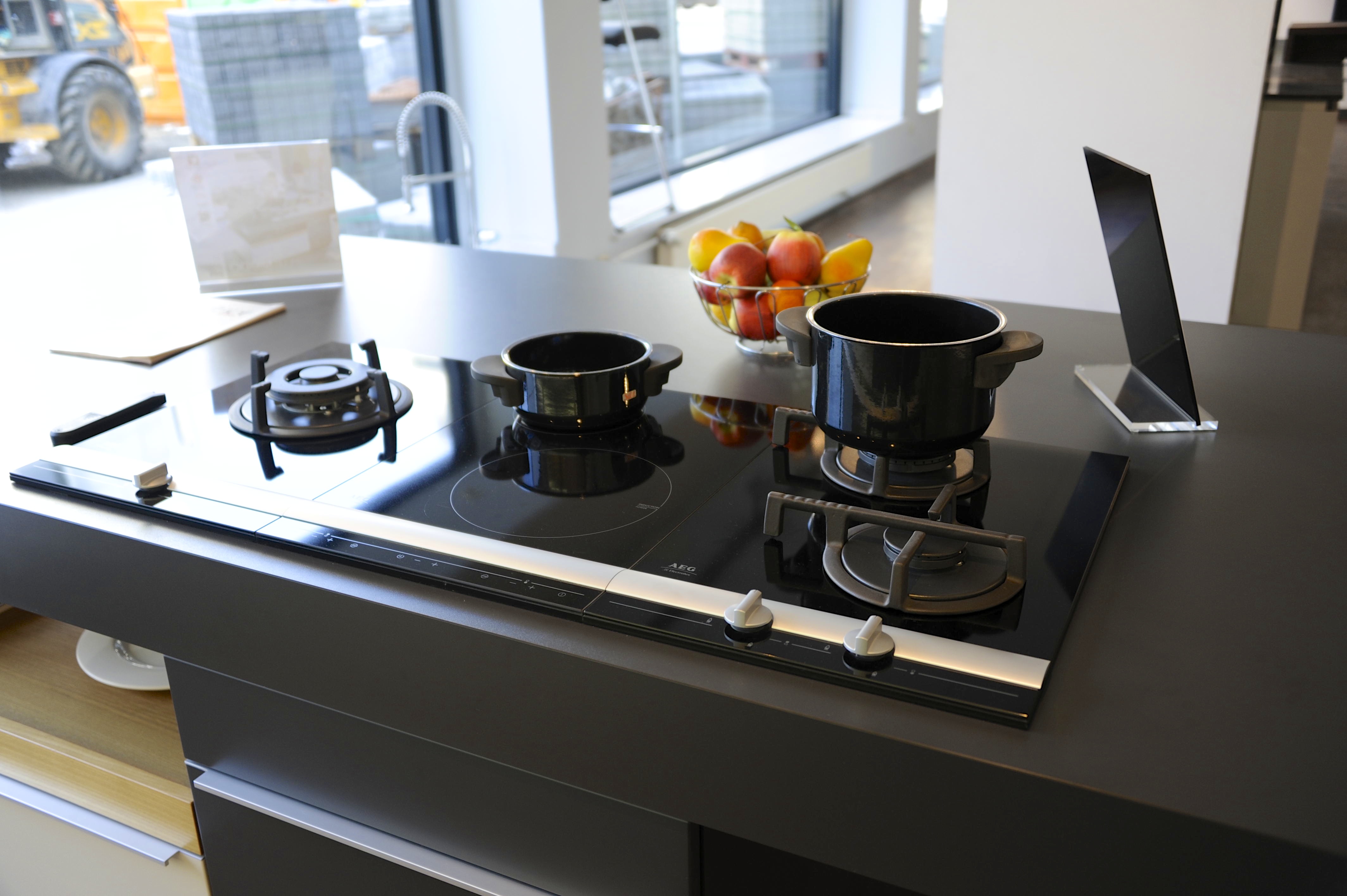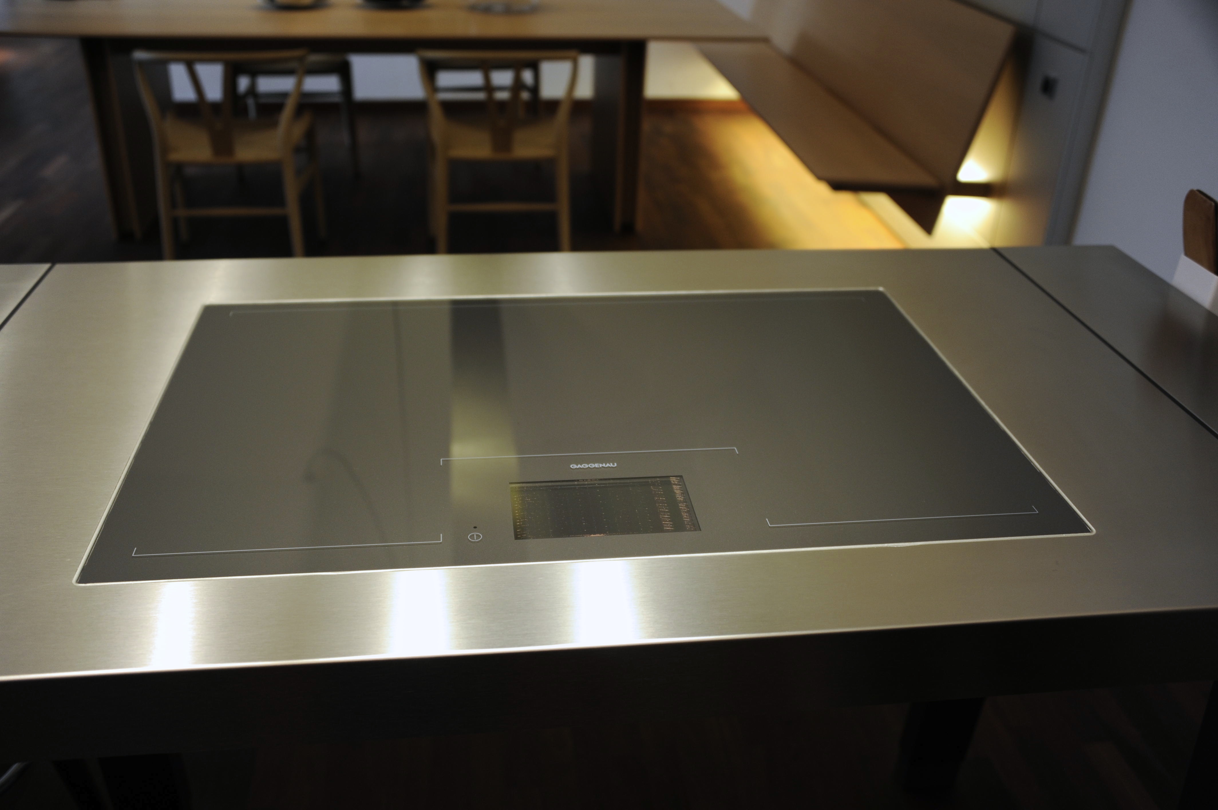 Installed into the countertop above, they had the pièce de résistance, a sweet, beautiful, gorgeous thing: the Gaggenau CX 480. It is an induction cooktop whose entire surface can be used to heat pans. Any size pan. Just throw it on and it will automatically detect its size and position and heat just that area.
