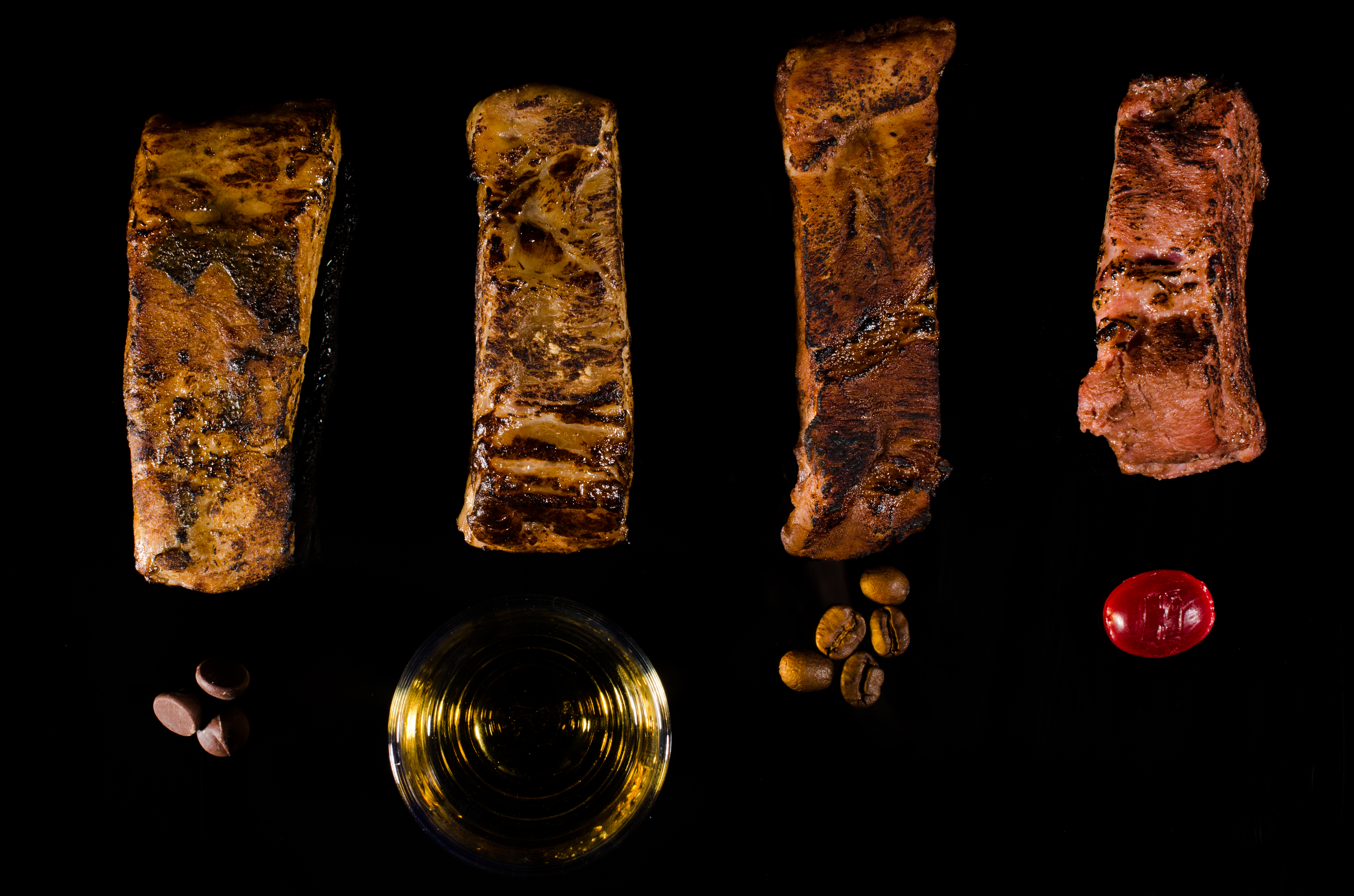 Sweet rib infusions from left to right: chocolate, spiced rum, coffee, cherry cough drop (Photo: Scott Heimendinger)
