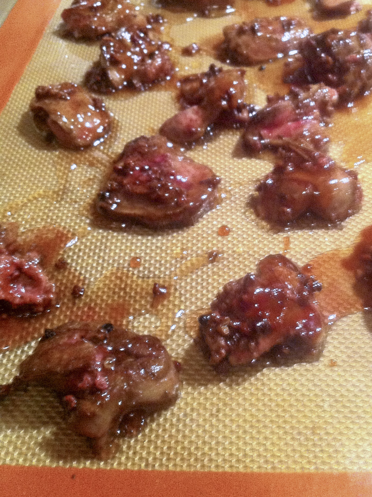 The initial idea of Chris’ was to make a bacon Turtle without the bacon getting chewy. It evolved into candied chicken livers (as you would of course expect, right?). I didn’t get any good photos of the chicken livers, but here’s a fuzzy phone pic to give you an idea: