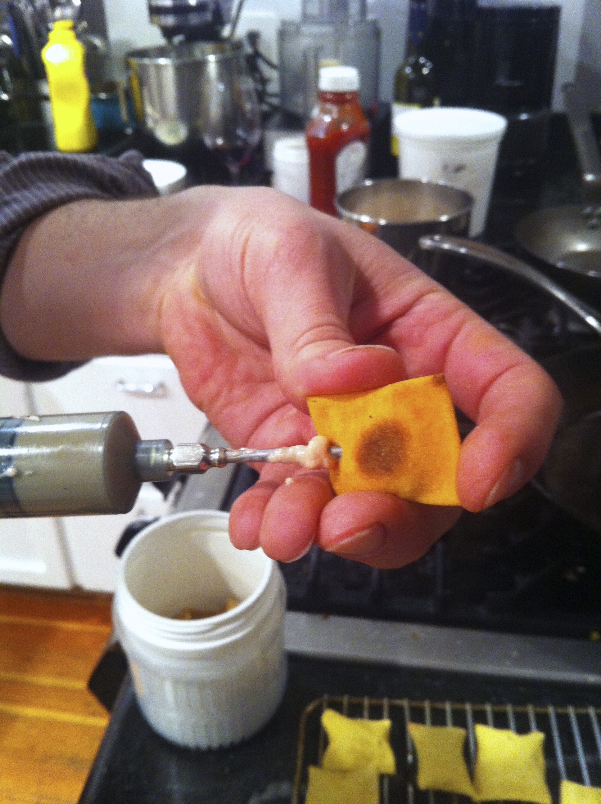 But first, Chris had a strange infused cheese he had already made – hot dogs blended with mozzarella and xanthan gum. And he had a bunch of freshly baked homemade crackers ready to go too. He took a syringe and pumped the cheese into the crackers.