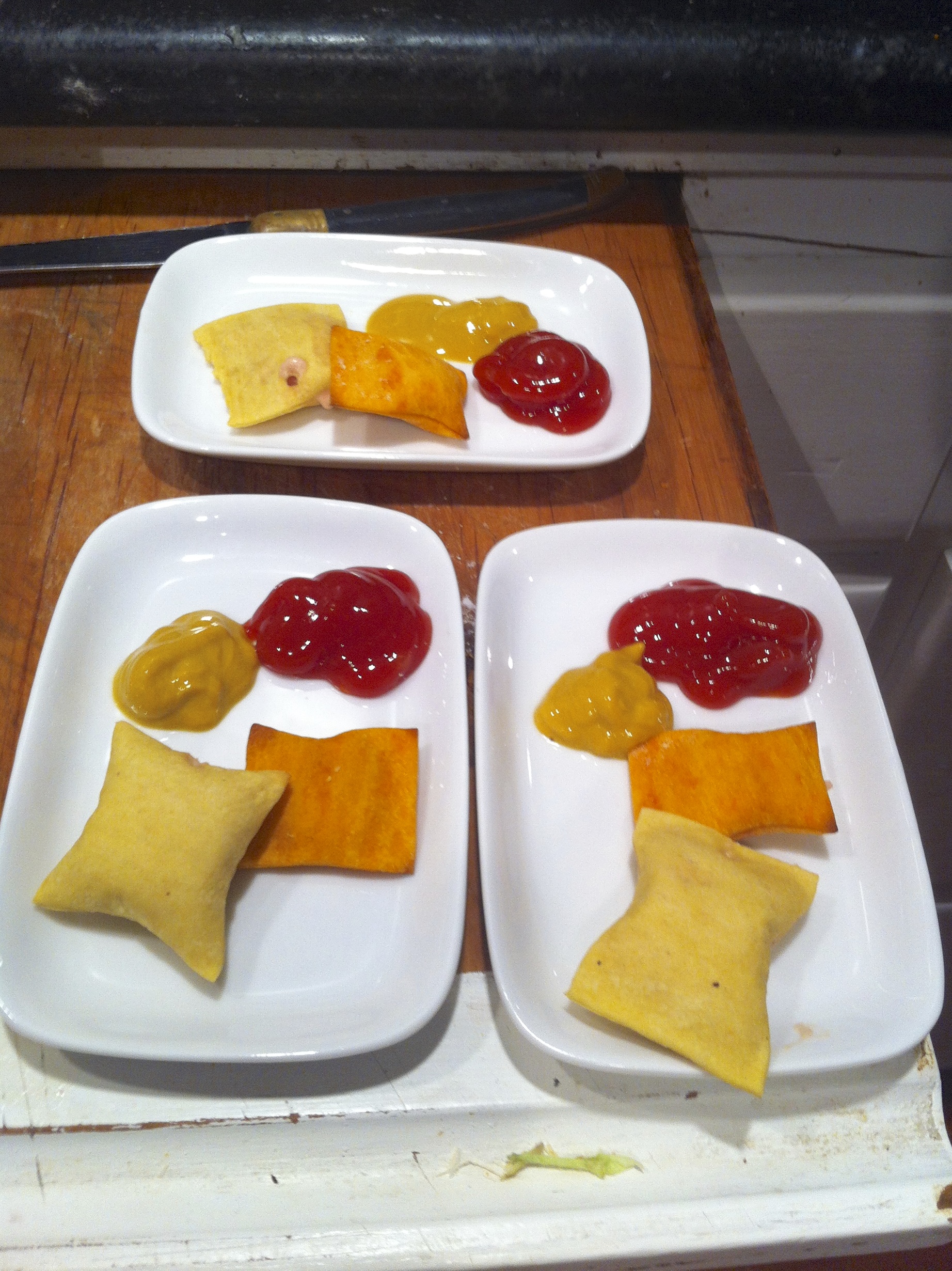 He plated them with two dipping sauces – ketchup and mustard.