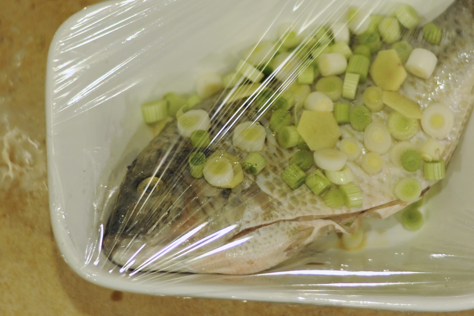 I put the ingredients on the fish, wrapped it up, and placed it in the microwave. The plastic wrap ballooned up as the steam was released, but thankfully, it never popped.