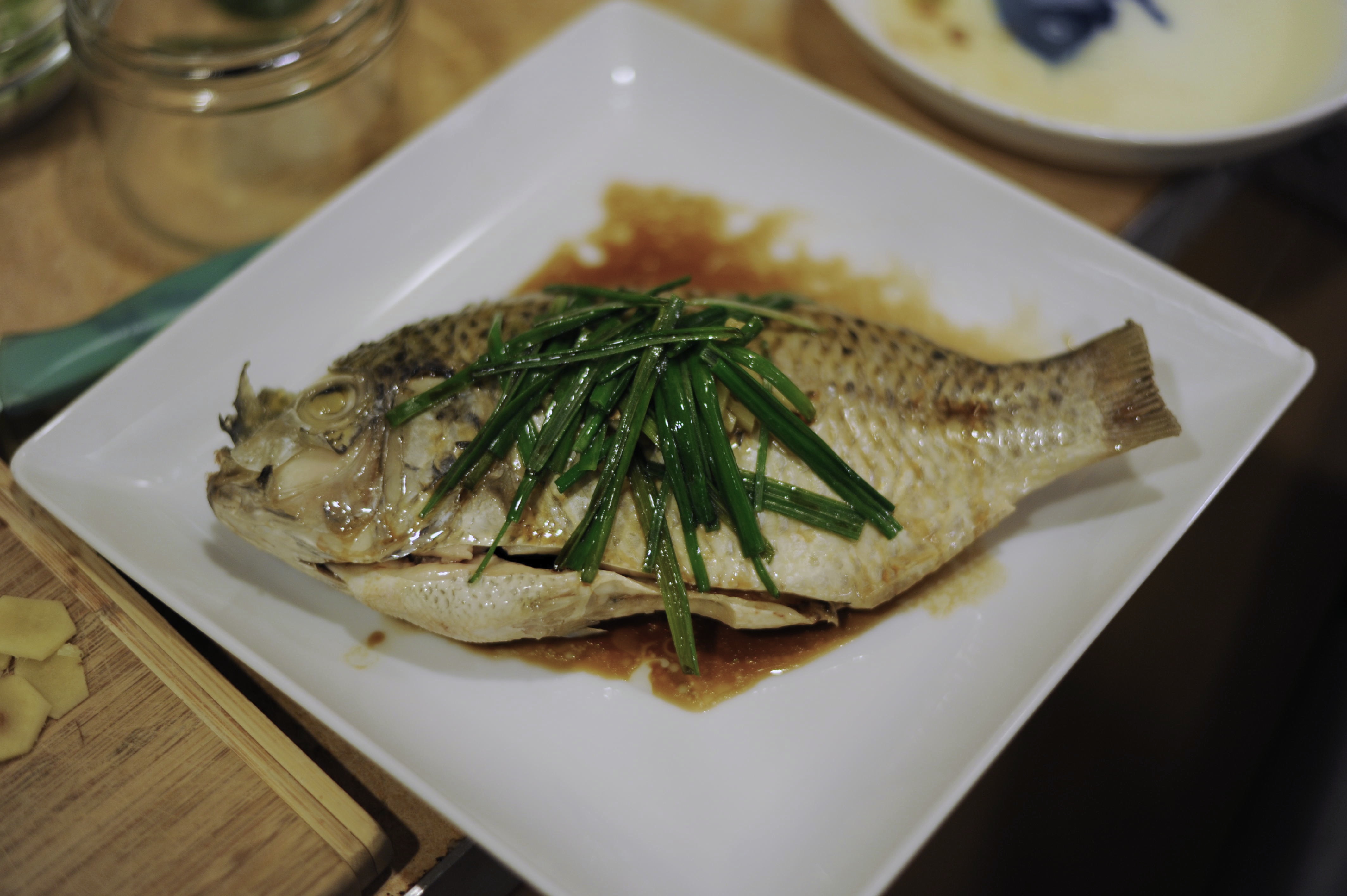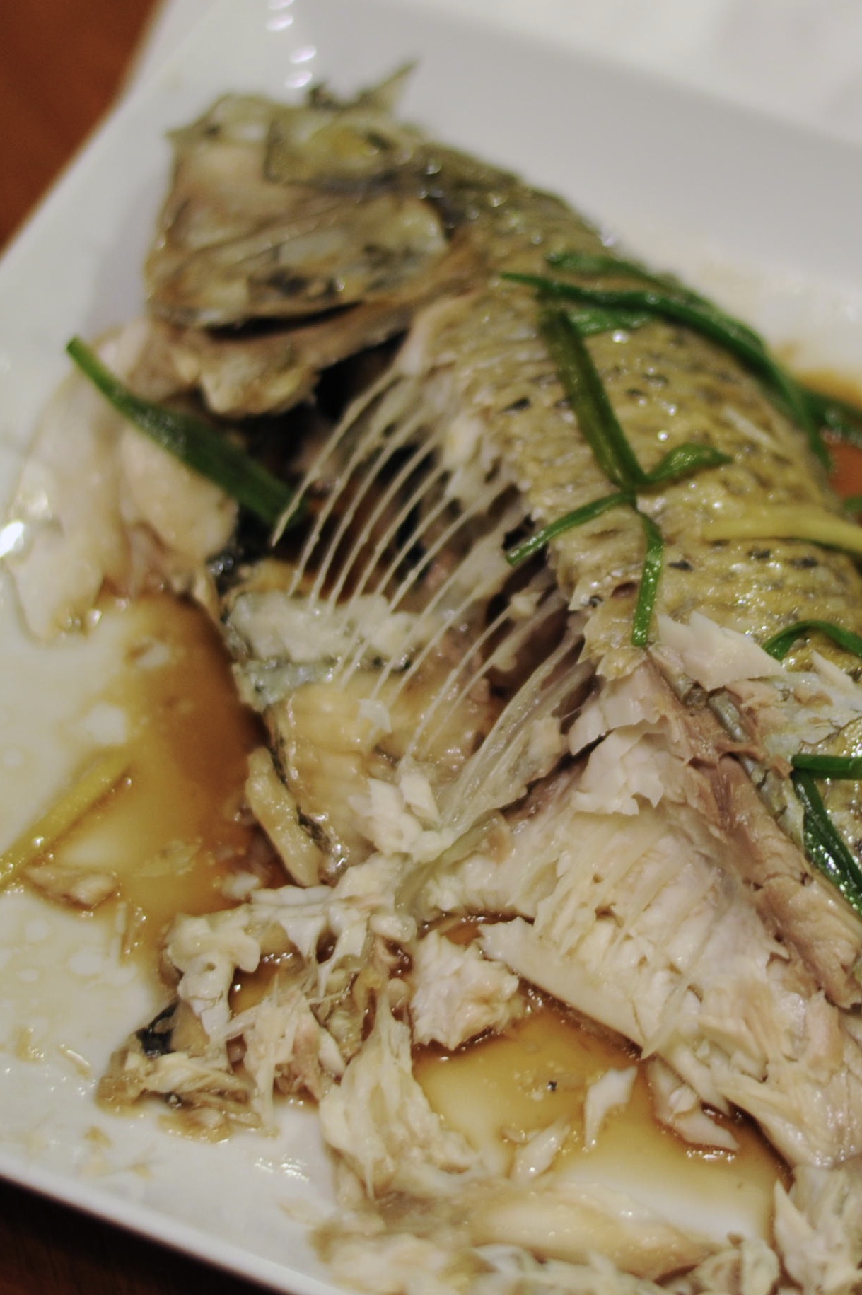 From there, I scraped off all the scallion whites and ginger (just meant to infuse flavor into the fish), then topped the fish with the fresh scallion greens and ginger and poured hot oil over it. The greens and fish skin made a satisfying hissing sound as the oil fried them up. I pulled the fish over to a clean plate, poured soy sauce and sesame oil over it and I was done. Now, I could have done what the recipe suggests: