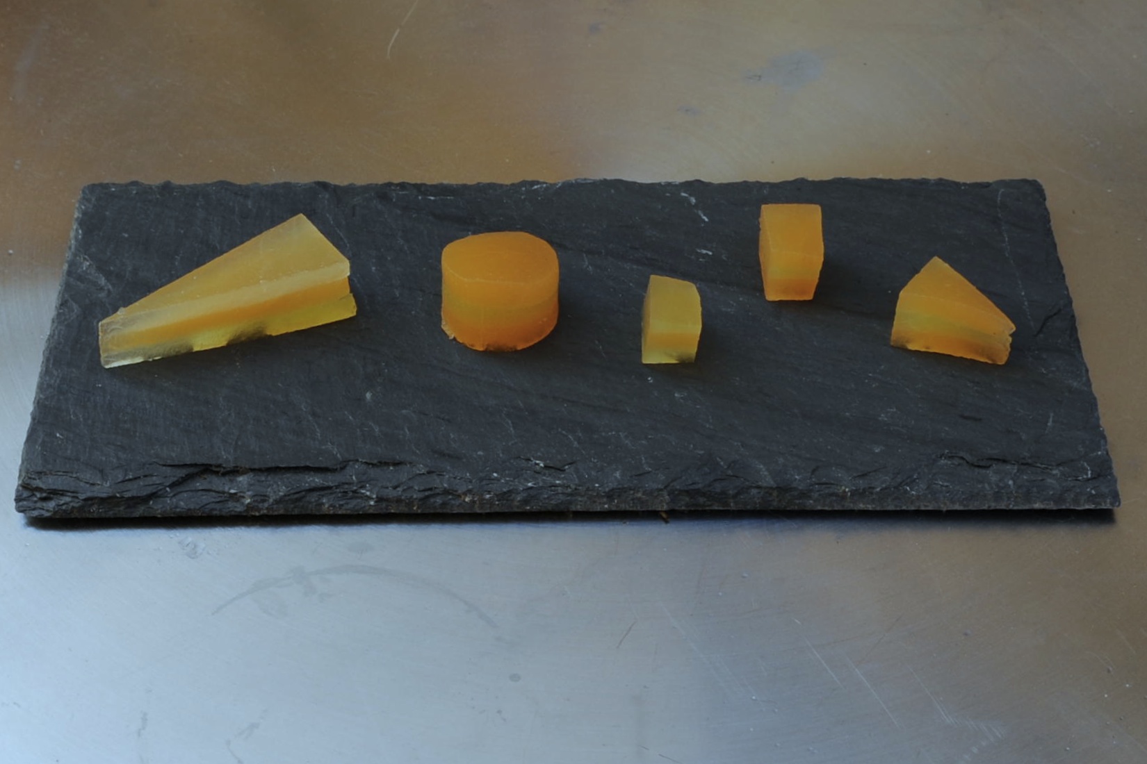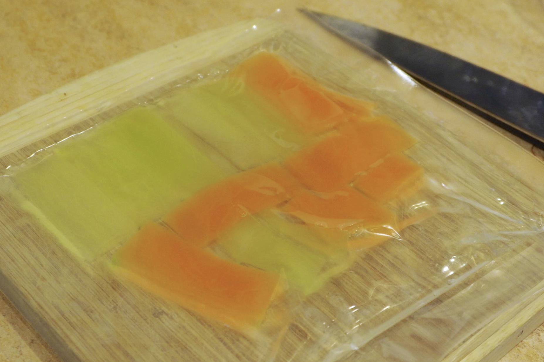 After 12 hours in the fridge, they were ready. I opened up the bags and cut them into shapes. A fruit terrine appetizer.