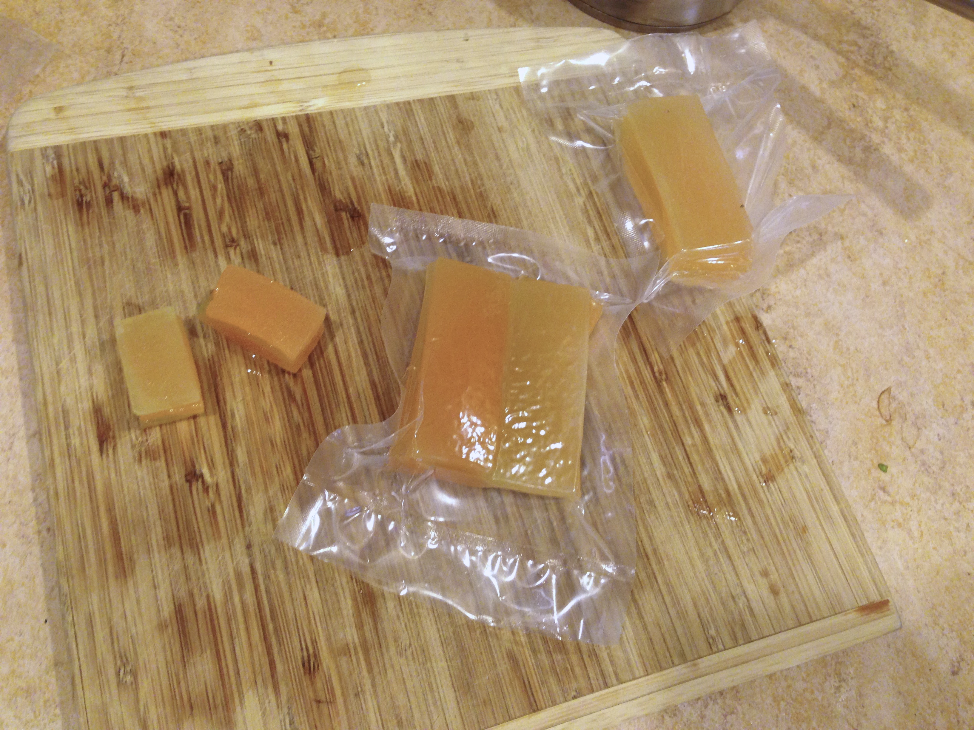 After brushing on the pectin and stacking the slices into terrines, I vacuum sealed them again to hold them tightly in place while the gel formed.