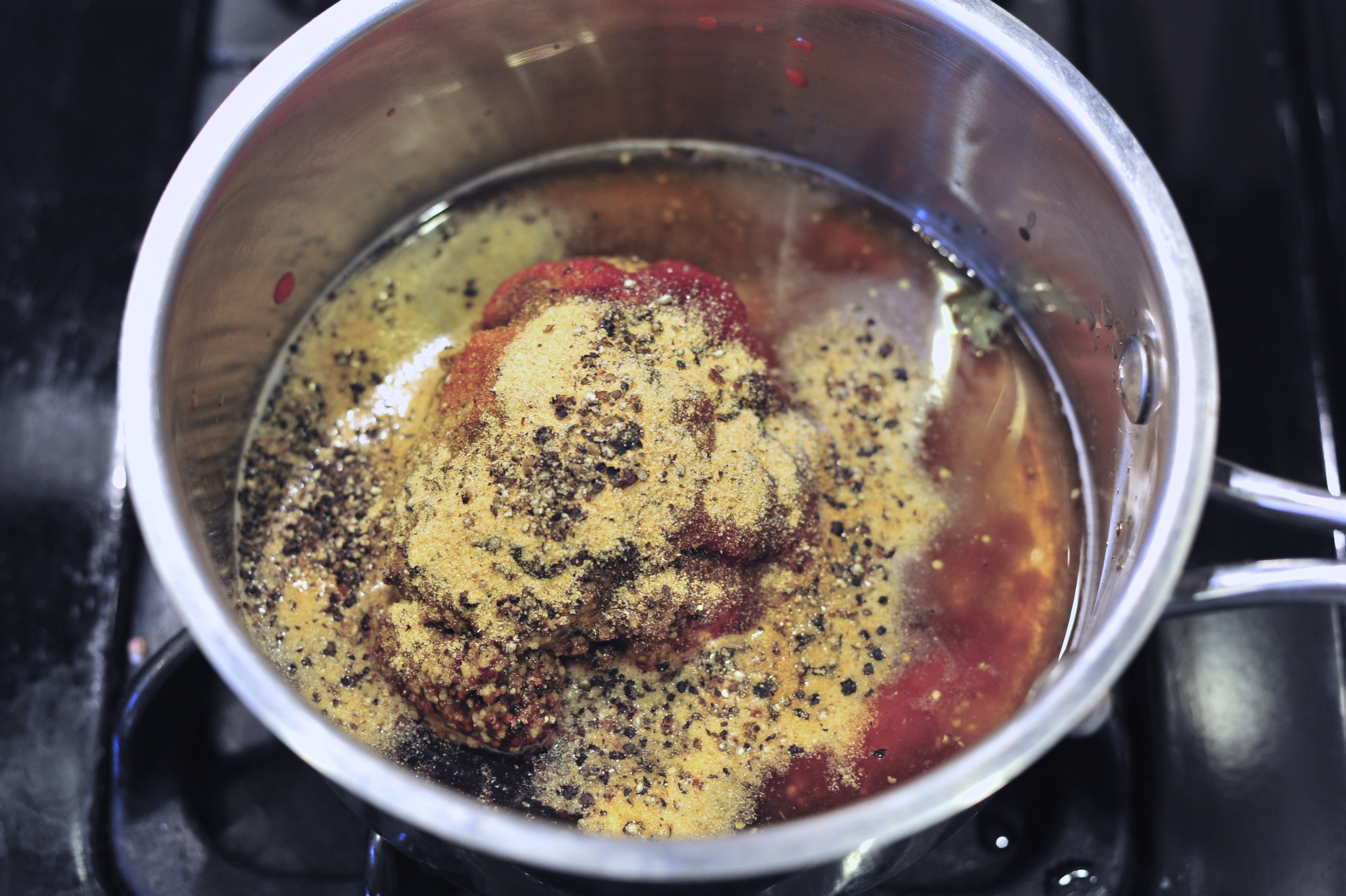 I rinsed off my pots and measuring bowls and utensils, and started over. This time I dumped in ketchup, cider vinegar, brown sugar, molasses, pineapple juice, Wild Turkey bourbon, bacon fat and worchestershire sauce. I mean, bacon fat with bourbon? Pure heaven. These Kentuckians know what they’re doing.