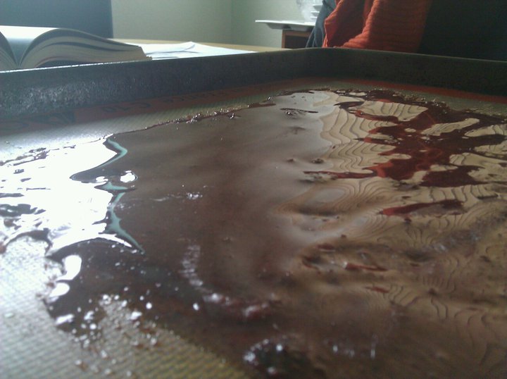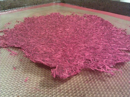 After I dehydrated it completely then I turned the cranberry into a powder then mixed. I weighed everything then tried an 11% use per weight ratio of pure cote. I heated the isomalt, glucose, cranberry, and pure cote to 160F then poured it over the silpat, let it dry overnight and then checked it out the next morning.
